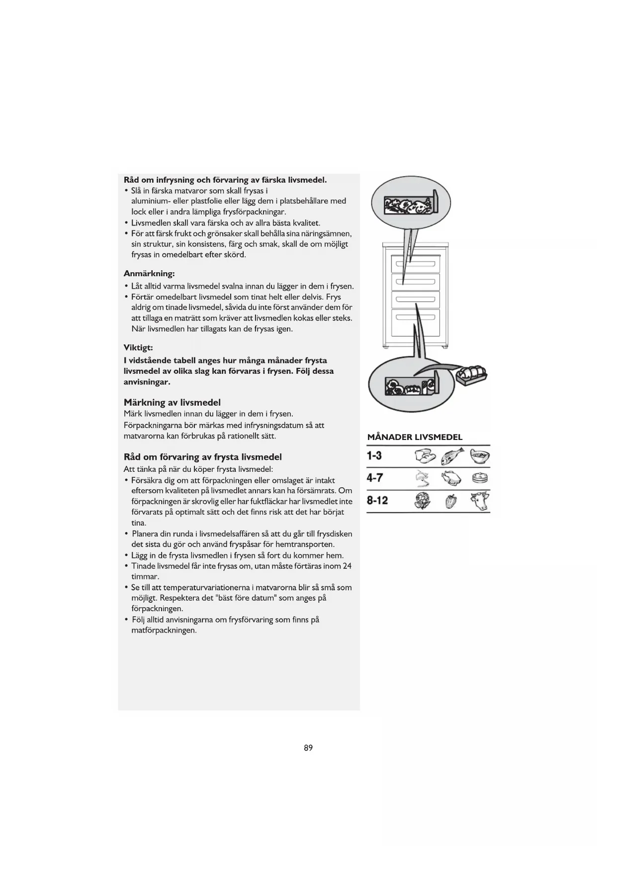 - Förtär omedelbart livsmedel som tinat helt eller delvis. Frys aldrig om tinade livsmedel, såvida du inte först använder dem för att tillaga en maträtt som kräver att livsmedlen kokas eller steks. När livsmedlen har tillagats kan de frysas igen. Viktigt: I vidstående tabell anges hur många månader frysta livsmedel av olika slag kan förvaras i frysen. Följ dessa anvisningar. Märkning av livsmedel Märk livsmedlen innan du lägger in dem i frysen. Förpackningarna bör märkas med infrysningsdatum så att matvarorna kan förbrukas på rationellt sätt. Råd om förvaring av frysta livsmedel Att tänka på när du köper frysta livsmedel: