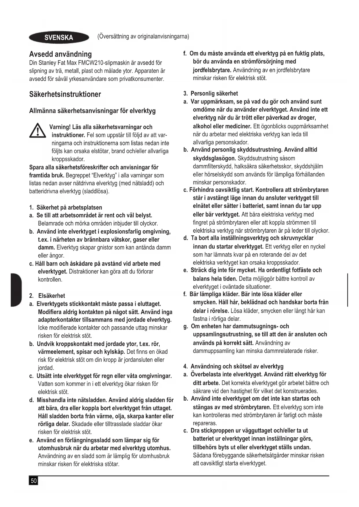 FMCW210 - slipmaskin Stanley Europe garanterar att produkterna som beskrivs under “tekniska data” uppfyller: 2006/42/EG, EN60745-1:2009+A11:2010 EN60745-2- 4:2009+A11:2011 De här produkterna överensstämmer även med direktiven 2014/30/EU och 2011/65/EU. För ytterligare information, kontakta Stanley Europe på följande adress eller se slutet av bruksanvisningen. Undertecknad är ansvarig för sammanställningen av tekniska data och gör denna försäkran för Black & Decker. R. Laverick Director of Engineering Stanley Europe, Egide Walschaertsstraat14–18, 2800 Mechelen, Belgien 17/08/2017 Garanti Stanley Fat Max är säkra på kvaliteten hos denna produkt och erbjuder kunder 12 månaders garanti från inköpsdatumet. Garantin gäller utöver konsumentens rättigheter enligt lag och påverkar inte dessa. Garantin är giltig i de områden som tillhör medlemsstaterna i Europeiska unionen och det europeiska frihandelsområdet. För yrkande under garantin måste yrkandet vara in enlighet med Stanley Fat Max villkor och du kommer att behöva skicka in bevis på köpet till försäljaren eller en auktoriserad reparatör. Villkoren för Stanley Fat Max ettåriga garanti och var du hittar din närmaste auktoriserade reparatör kan erhållas på internet på www.2helpU.com, eller genom att kontakta ditt lokal Stanley Fat Max kontor på adressen som angetts i denna bruksanvisning. Besök vår webbplats www.stanley.eu/3 för att registrera din nya Stanley Fat Max produkt samt för att få information om nya produkter och specialerbjudanden.56 (Oversettelse av de opprinnelige instruksjonene) NORSK Tiltenkt bruk Sliperen Stanley Fat Max FMCW210 er utviklet for sliping av treverk, metall, plast og malte overater. Dette apparatet er tiltenkt både fagarbeidere og private brukere. Sikkerhetsinstruksjoner Generelle sikkerhetsadvarsler for elektroverktøy