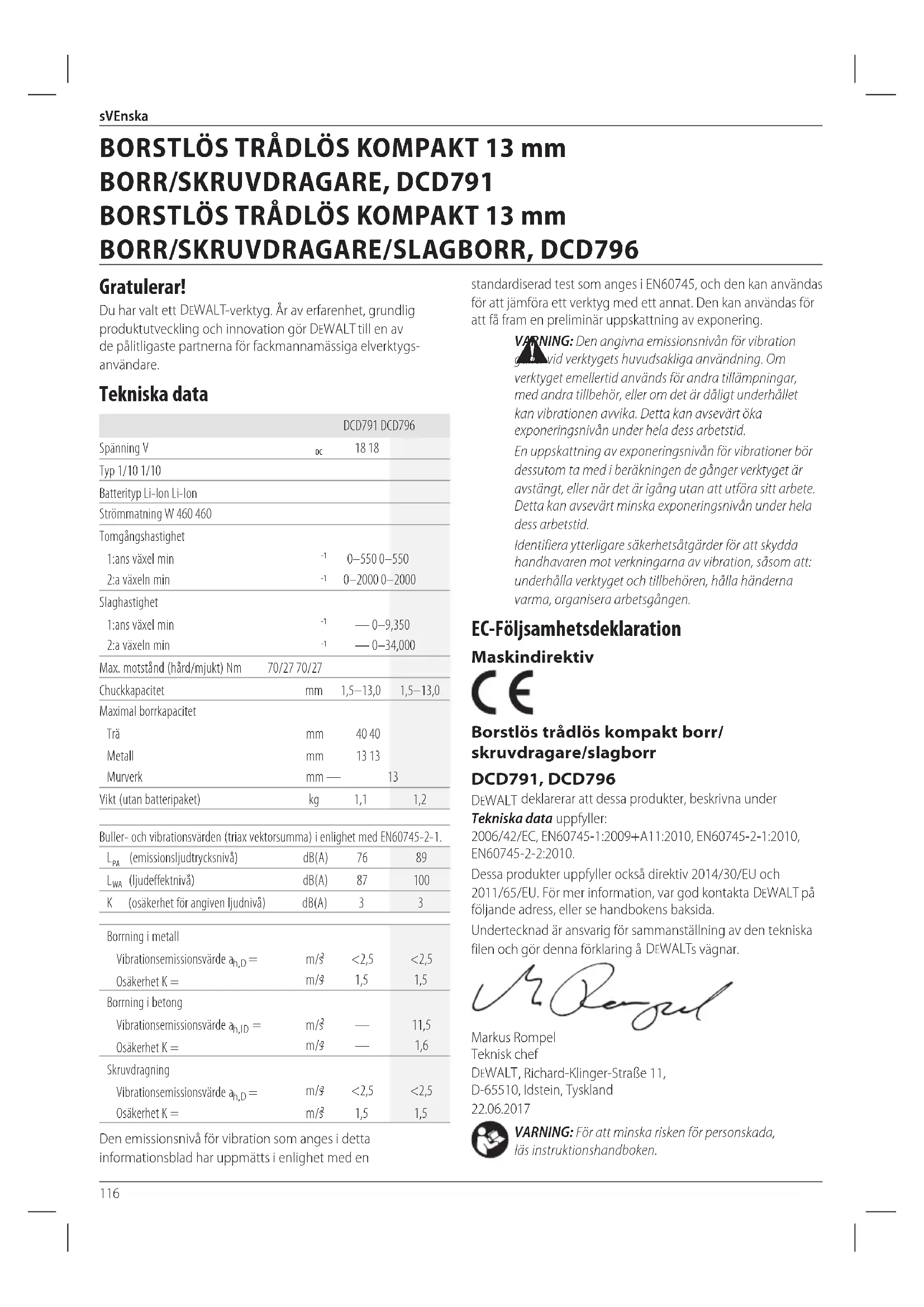 Undertecknad är ansvarig för sammanställning av den tekniska filen och gör denna förklaring å DEWALTs vägnar.