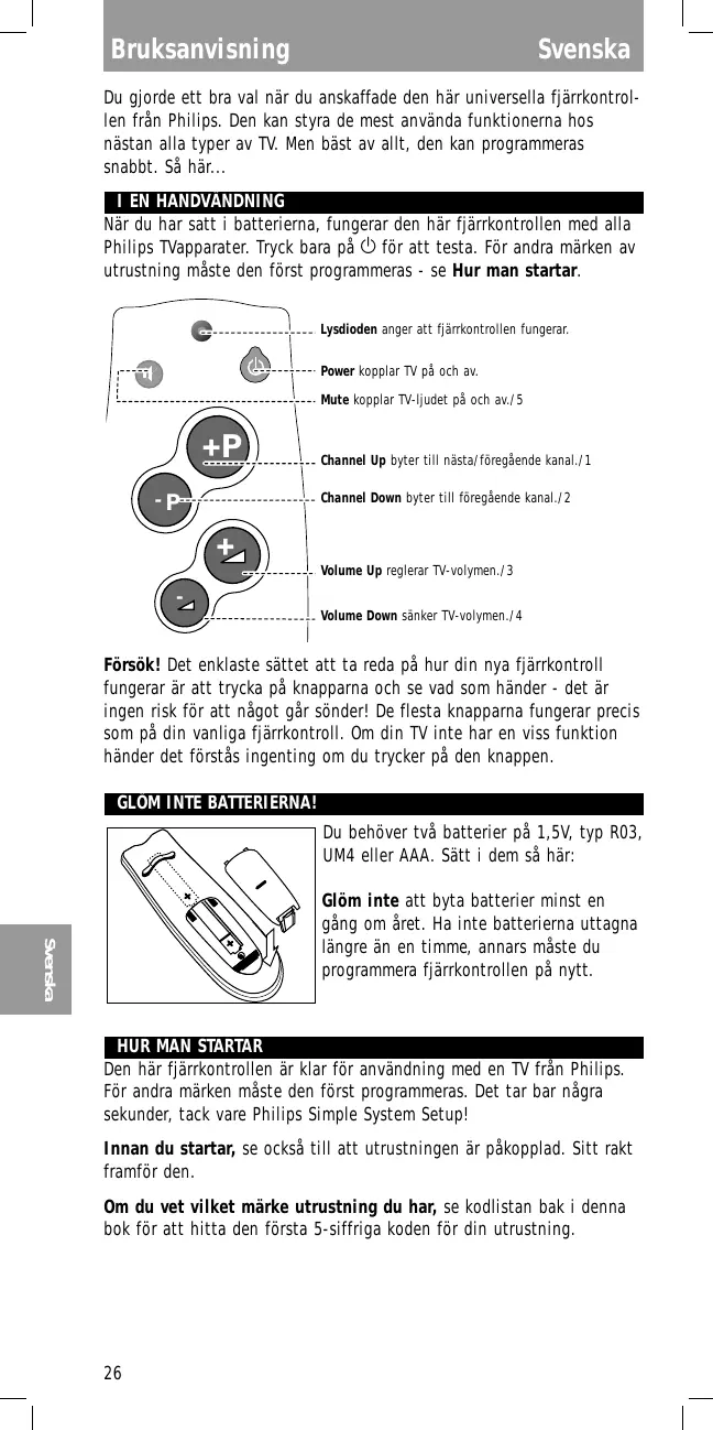 RU455- page 26 Bruksanvisning Svenska Du gjorde ett bra val när du anskaffade den här universella fjärrkontrollen från Philips. Den kan styra de mest använda funktionerna hos nästan alla typer av TV. Men bäst av allt, den kan programmeras snabbt. Så här...