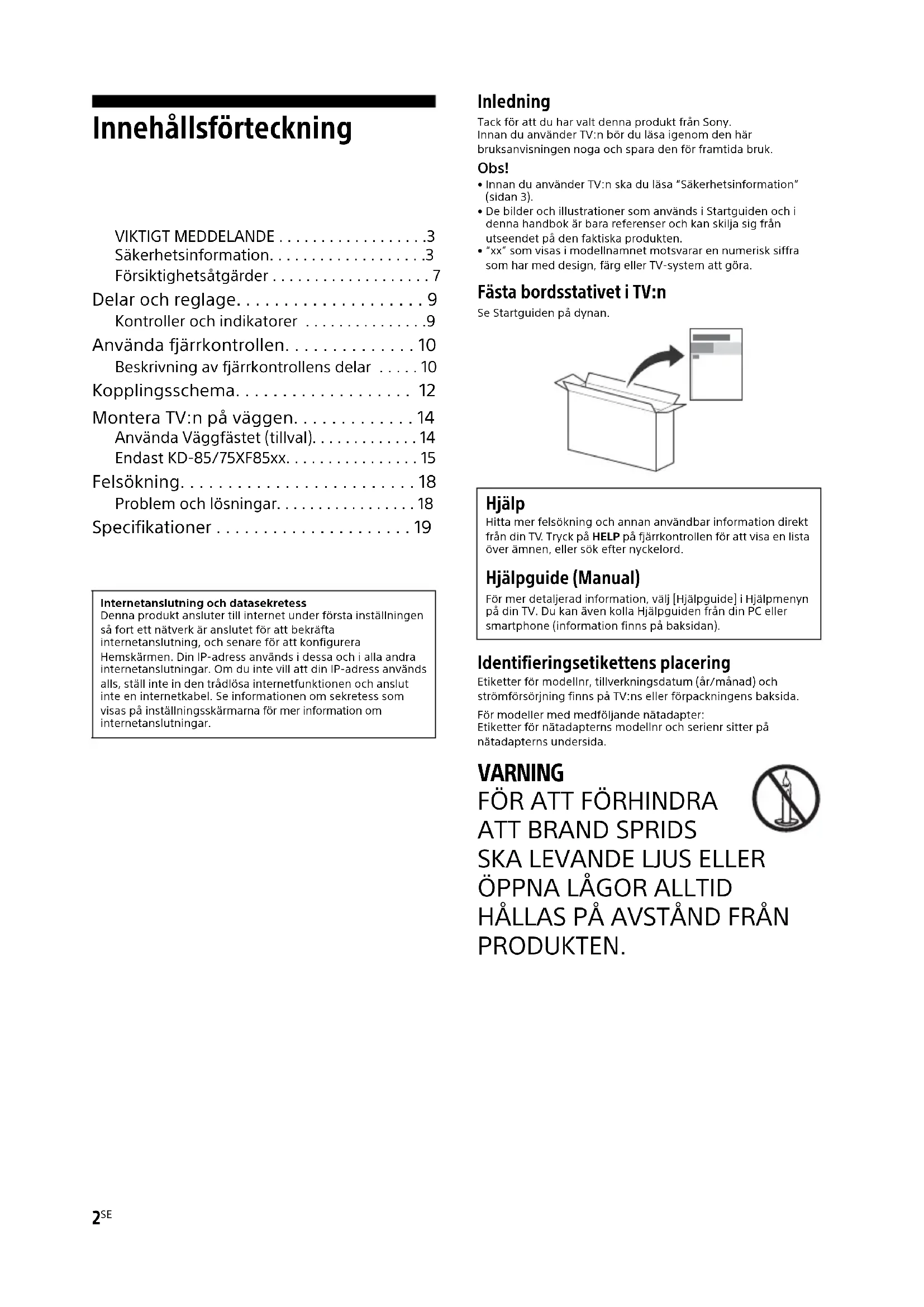 HÅLLAS PÅ AVSTÅND FRÅN PRODUKTEN. Internetanslutning och datasekretessDenna produkt ansluter till internet under första inställningen så fort ett nätverk är anslutet för att bekräfta internetanslutning, och senare för att konfigurera Hemskärmen. Din IP-adress används i dessa och i alla andra internetanslutningar. Om du inte vill att din IP-adress används alls, ställ inte in den trådlösa internetfunktionen och anslut inte en internetkabel. Se informationen om sekretess som visas på inställningsskärmarna för mer information om internetanslutningar. Hjälp Hitta mer felsökning och annan användbar information direkt från din TV. Tryck på HELP på fjärrkontrollen för att visa en lista över ämnen, eller sök efter nyckelord. Hjälpguide (Manual) För mer detaljerad information, välj [Hjälpguide] i Hjälpmenyn på din TV. Du kan även kolla Hjälpguiden från din PC eller smartphone (information finns på baksidan).3