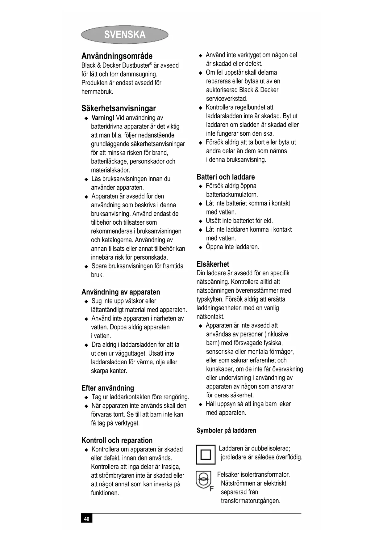 är avsedd för lätt och torr dammsugning. Produkten är endast avsedd för hemmabruk. Säkerhetsanvisningar Varning! Vid användning av batteridrivna apparater är det viktig att man bl.a. följer nedanstående grundläggande säkerhetsanvisningar för att minska risken för brand, batteriläckage, personskador och materialskador. Läs bruksanvisningen innan du använder apparaten. Apparaten är avsedd för den användning som beskrivs i denna bruksanvisning. Använd endast de tillbehör och tillsatser som rekommenderas i bruksanvisningen och katalogerna. Användning av annan tillsats eller annat tillbehör kan innebära risk för personskada. Spara bruksanvisningen för framtida bruk. Användning av apparaten Sug inte upp vätskor eller lättantändligt material med apparaten. Använd inte apparaten i närheten av vatten. Doppa aldrig apparaten i vatten. Dra aldrig i laddarsladden för att ta ut den ur vägguttaget. Utsätt inte laddarsladden för värme, olja eller skarpa kanter. Efter användning Tag ur laddarkontakten före rengöring. När apparaten inte används skall den förvaras torrt. Se till att barn inte kan få tag på verktyget. Kontroll och reparation Kontrollera om apparaten är skadad eller defekt, innan den används. Kontrollera att inga delar är trasiga, att strömbrytaren inte är skadad eller att något annat som kan inverka på funktionen. Använd inte verktyget om någon del är skadad eller defekt. Om fel uppstår skall delarna repareras eller bytas ut av en auktoriserad Black & Decker serviceverkstad. Kontrollera regelbundet att laddarsladden inte är skadad. Byt ut laddaren om sladden är skadad eller inte fungerar som den ska. Försök aldrig att ta bort eller byta ut andra delar än dem som nämns i denna bruksanvisning. Batteri och laddare Försök aldrig öppna batteriackumulatorn. Låt inte batteriet komma i kontakt med vatten. Utsätt inte batteriet för eld. Låt inte laddaren komma i kontakt med vatten. Öppna inte laddaren. Elsäkerhet Din laddare är avsedd för en specifik nätspänning. Kontrollera alltid att nätspänningen överensstämmer med typskylten. Försök aldrig att ersätta laddningsenheten med en vanlig nätkontakt. Apparaten är inte avsedd att användas av personer (inklusive barn) med försvagade fysiska, sensoriska eller mentala förmågor, eller som saknar erfarenhet och kunskaper, om de inte får övervakning eller undervisning i användning av apparaten av någon som ansvarar för deras säkerhet. Håll uppsyn så att inga barn leker med apparaten. Symboler på laddaren Laddaren är dubbelisolerad; jordledare är således överflödig. Felsäker isolertransformator. Nätströmmen är elektriskt separerad från transformatorutgången.41 SVENSKA Laddaren stängs automatiskt av om omgivningstemperaturen är för hög. I så fall går laddaren inte längre att använda. Apparaten måste kopplas lös från elnätet och lämnas in hos en auktoriserad servicepunkt för reparation. Laddaren är endast avsedd för inomhusbruk. Läs bruksanvisningen innan du använder apparaten. Varning! Förvara elektriska apparater utom räckhåll för barn och sjuka. Låt dem aldrig använda apparaterna utan tillsyn. Detaljbeskrivning