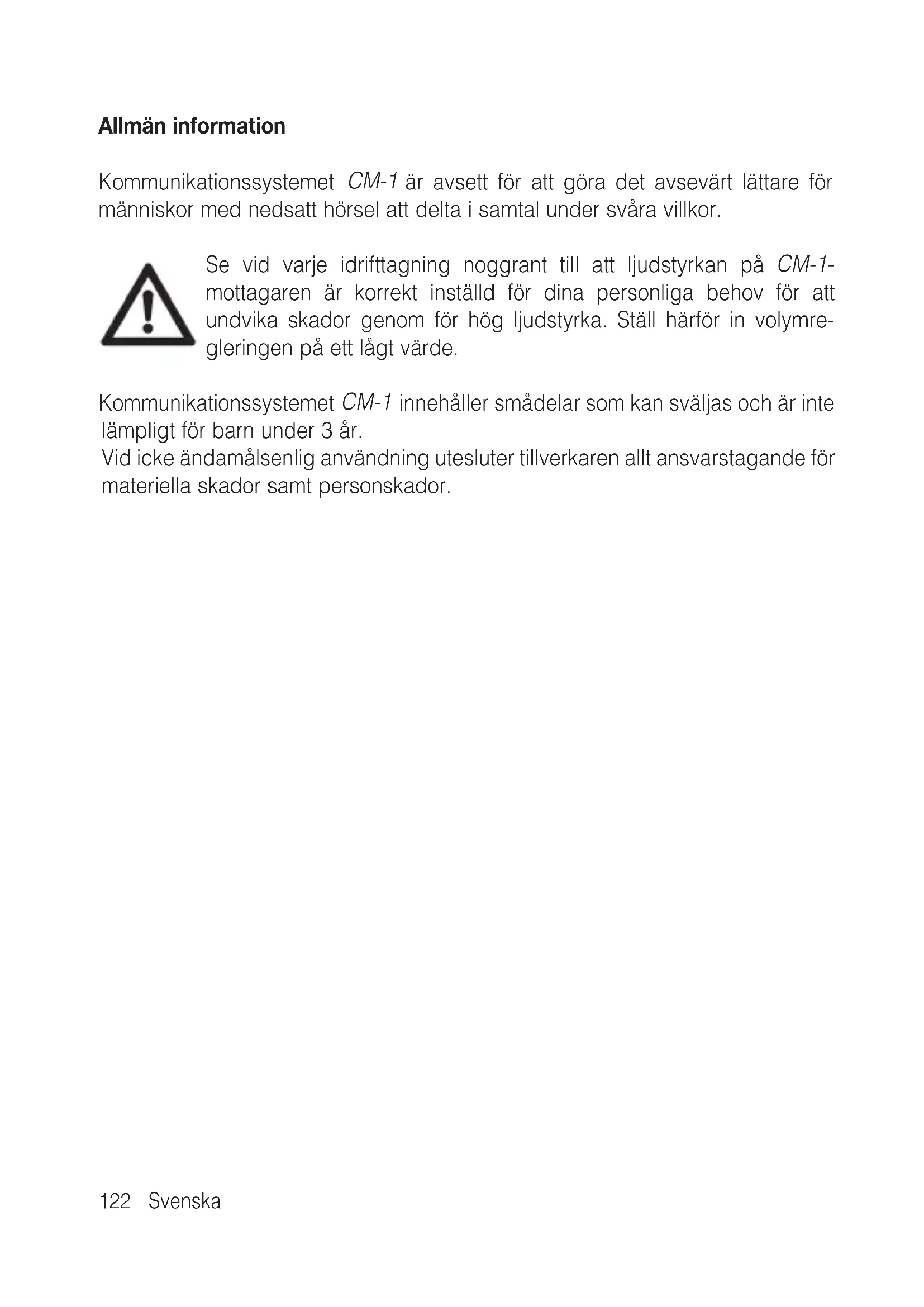 Se vid varje idrifttagning noggrant till att ljudstyrkan på CM-1-mottagaren ar korrekt installd for dina personliga behov for att undvika skador genom for hog ljudstyrka. Stall harforn volymregleringen på ett lagt varde.