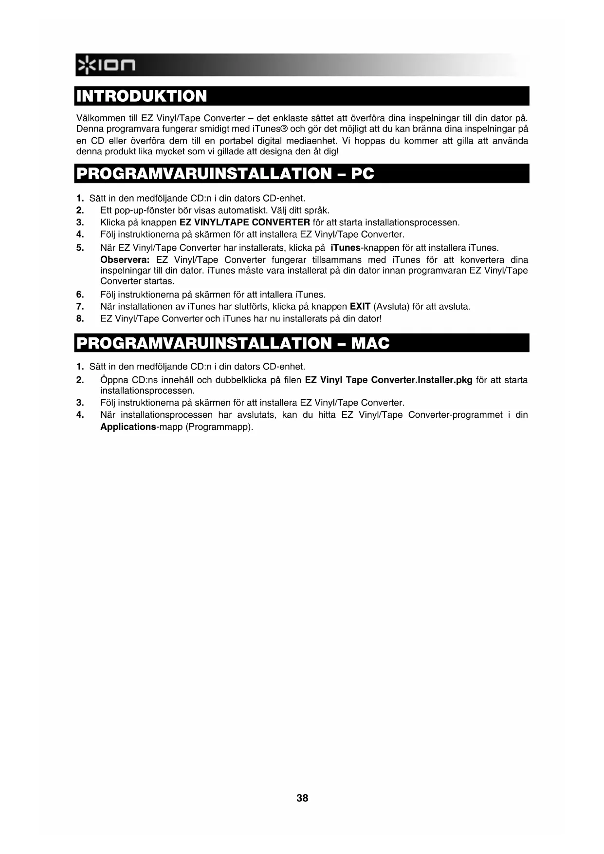 Fråga: Vilka operativsystem är EZ Vinyl/Tape Converter kompatibel med? Svar: EZ Vinyl/Tape Converter är för närvarande kompatibel med operativsystemen Windows XP, Vista och 7 (32-bitars eller 64-bitars, samt med operativsystemet Mac OS X 10.4.11 (eller högre). Fråga: Till vilket digitalt format konverteras mina inspelningar till? Svar: Inspelningarna konverteras till MP3-filer och till det bitvärde som valts i Import Settings (Impotera inställningar) i iTunes. För att visa/ändra dessa inställningar i iTunes, klicka på menyn Edit (Redigera) och välj Preferences (Preferenser) och välj sedan fliken General (Allmänt) och klicka på knappen Import Settings (Importera inställningar). Klicka på rullgardinsmenyn Import Using (Importera med) och välj MP3 Encoder (MP3-avkodare). Nu kan du välja önskat antal bitar under rullgardingsmenyn Setting (Inställning). Fråga: Vart lagras mina inspelningar på datorn? Svar: Dina inspelningar lagras i iTunes musikmapp (Music folder). Som standard finns denna mapp i My Documents (Mina dokument) My Music iTunes iTunes Music på Windows OS, eller i Music iTunes iTunes Music på Mac OS och innehållet är organiserat efter Artist. Fråga: Hur bränner jag mina inspelningar på en CD? Svar: Det finns olika sätt som du kan bränna dina inspelningar på en CD på. Du kan antingen använda iTunes eller ett annat CD-brännarprogram. För att bränna en CD med iTunes, skapa en ny Playlist (Spellista) och dra låtarna från ditt vanliga bibliotek till denna spellista. När du har lagt till de låtar som du vill ha, klicka på spellistan och på knappen Burn Disc (Bränn CD). Hänvisa till iTunes hjälpmeny (eller ditt alternativa program) för mer information. Fråga: Kan jag lyssna på musiken på min dator när jag spelar in? Svar: Ja. EZ Vinyl/Tape Converter spelar automatiskt upp inkommande ljud genom din dator när musiken överförs. Om du använder flera ljudenheter, rekommenderar vi att du avaktiverar de enheter som du inte vill använda som monitorer. För de flesta användare är detta inte något problem.www.ionaudio.com