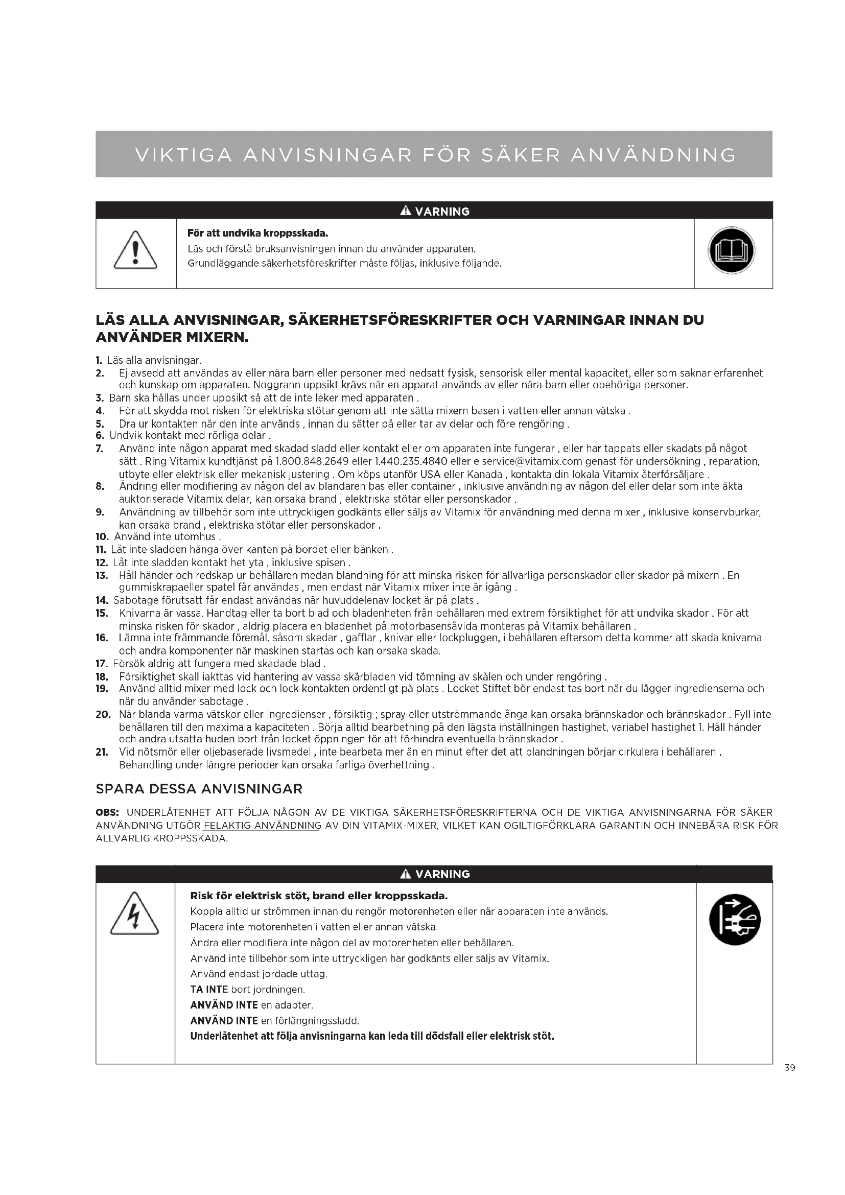 7. Använd inte någon apparat med skadad sladd eller kontakt eller om apparaten inte fungerar , eller har tappats eller skadats på något sätt . Ring Vitamix kundtjänst på 1.800.848.2649 eller 1.440.235.4840 eller e service@vitamix.com genast för undersökning , reparation, utbyte eller elektrisk eller mekanisk justering . Om köps utanför USA eller Kanada , kontakta din lokala Vitamix återförsäljare . 8. Ändring eller modifiering av någon del av blandaren bas eller container , inklusive användning av någon del eller delar som inte äkta auktoriserade Vitamix delar, kan orsaka brand , elektriska stötar eller personskador . 9. Användning av tillbehör som inte uttryckligen godkänts eller säljs av Vitamix för användning med denna mixer , inklusive konservburkar, kan orsaka brand , elektriska stötar eller personskador .