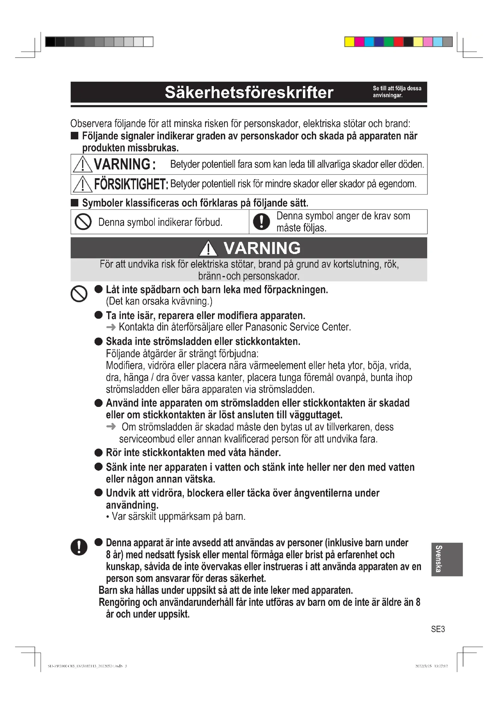 Panasonic tar inget ansvar om enheten inte har använts på ett korrekt sätt, eller om dessa instruktioner har inte följts. SD-ZP2000 OI3_DZ50B2113_20220524.indb 2SD-ZP2000 OI3_DZ50B2113_20220524.indb 2 2022/5/25 13:27:122022/5/25 13:27:12SE3 Svenska Observera följande för att minska risken för personskador, elektriska stötar och brand: