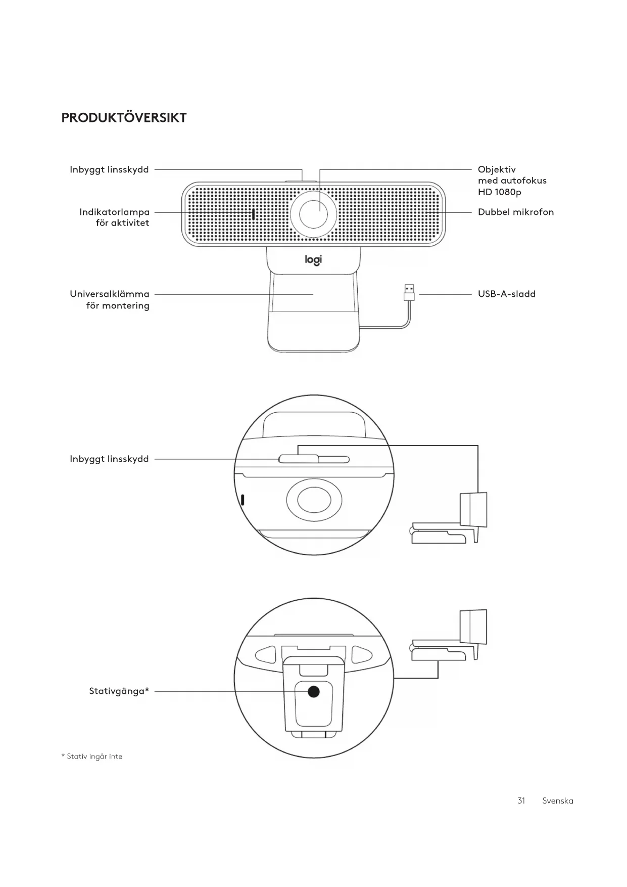 Sluit de USB-connector op de USB-A-poort van jecomputer aan.PRODUKTÖVERSIKT Inbyggt linsskydd Indikatorlampa föraktivitet Universalklämma för montering Inbyggt linsskydd Stativgänga* Dubbel mikrofon Objektiv medautofokus HD1080p USB-A-sladd *Stativ ingår inte 31 SvenskaUSB-A INNEHÅLL 1 Webbkamera med 1,83 m (1,6 fot) USB-A-sladd 2 Bruksanvisning