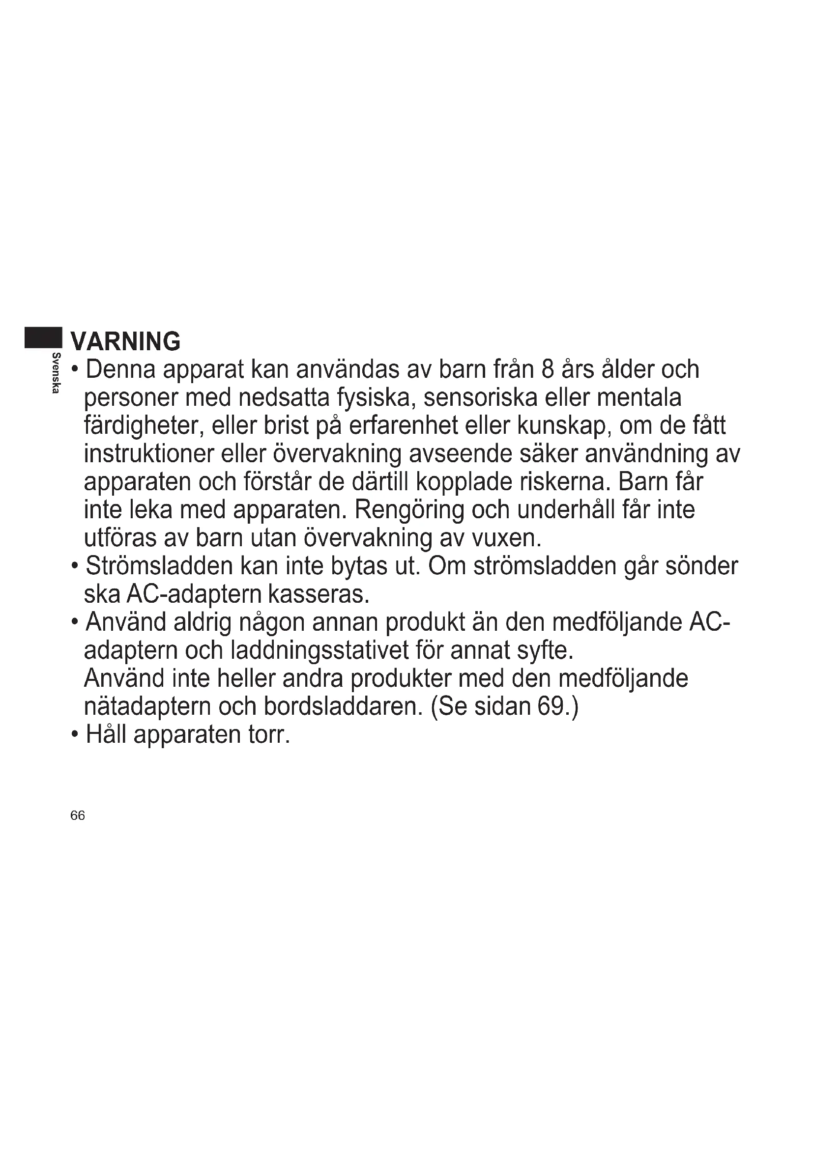 - Denna apparat kan användas av barn från 8 års ålder och personer med nedsatta fysiska, sensoriska eller mentala färdigheter, eller brist på erfarenhet eller kunskap, om de fått instruktioner eller övervakning avseende säker användning av apparaten och förstår de därtill kopplade riskerna. Barn får inte leka med apparaten. Rengöring och underhåll får inte utföras av barn utan övervakning av vuxen.