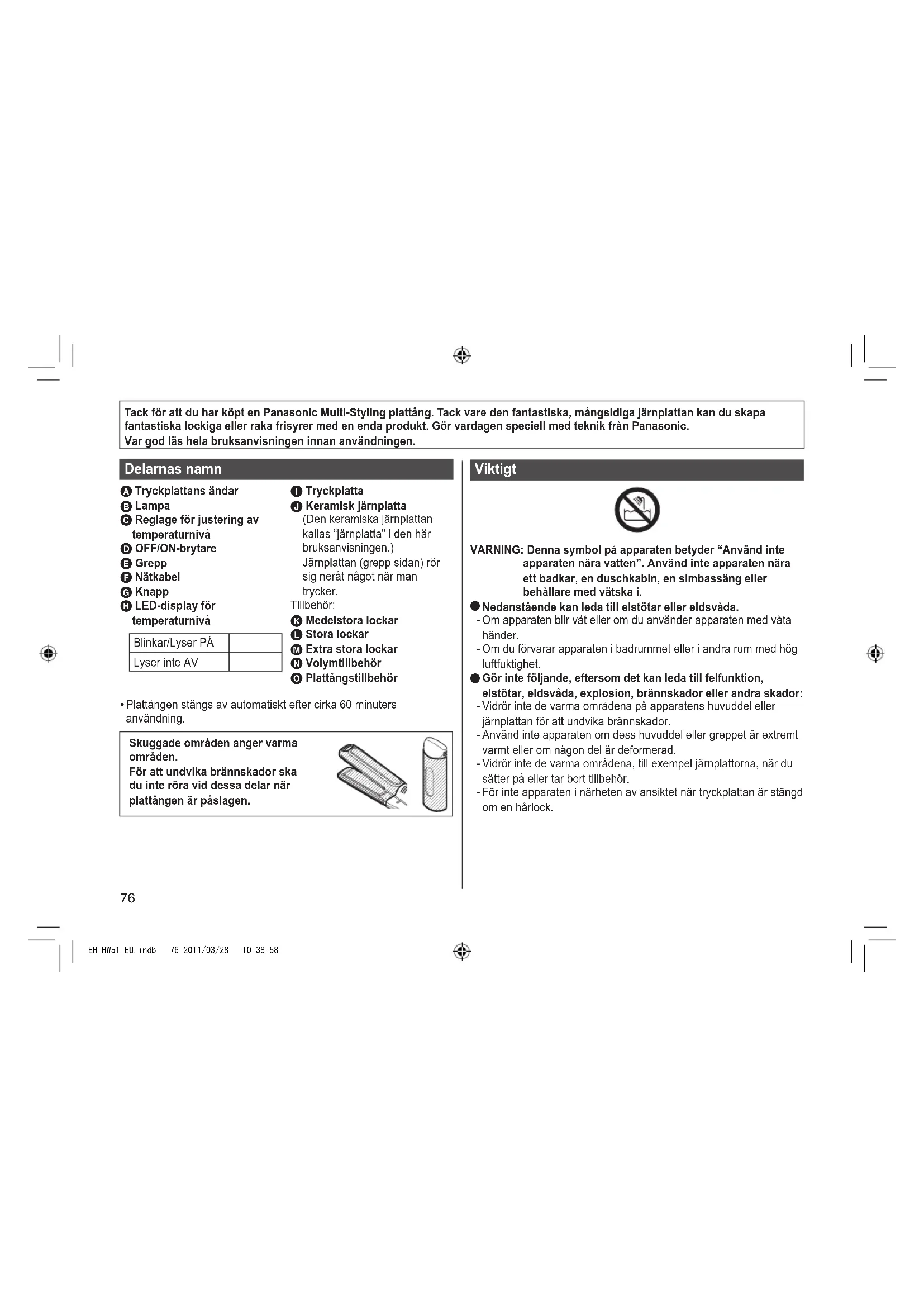 EH-HW51_EU.indb 75 2011/03/28 10:38:5876 Tack för att du har köpt en Panasonic Multi-Styling plattång. Tack vare den fantastiska, mångsidiga järnplattan kan du skapa fantastiska lockiga eller raka frisyrer med en enda produkt. Gör vardagen speciell med teknik från Panasonic. Var god läs hela bruksanvisningen innan användningen. Delarnas namn