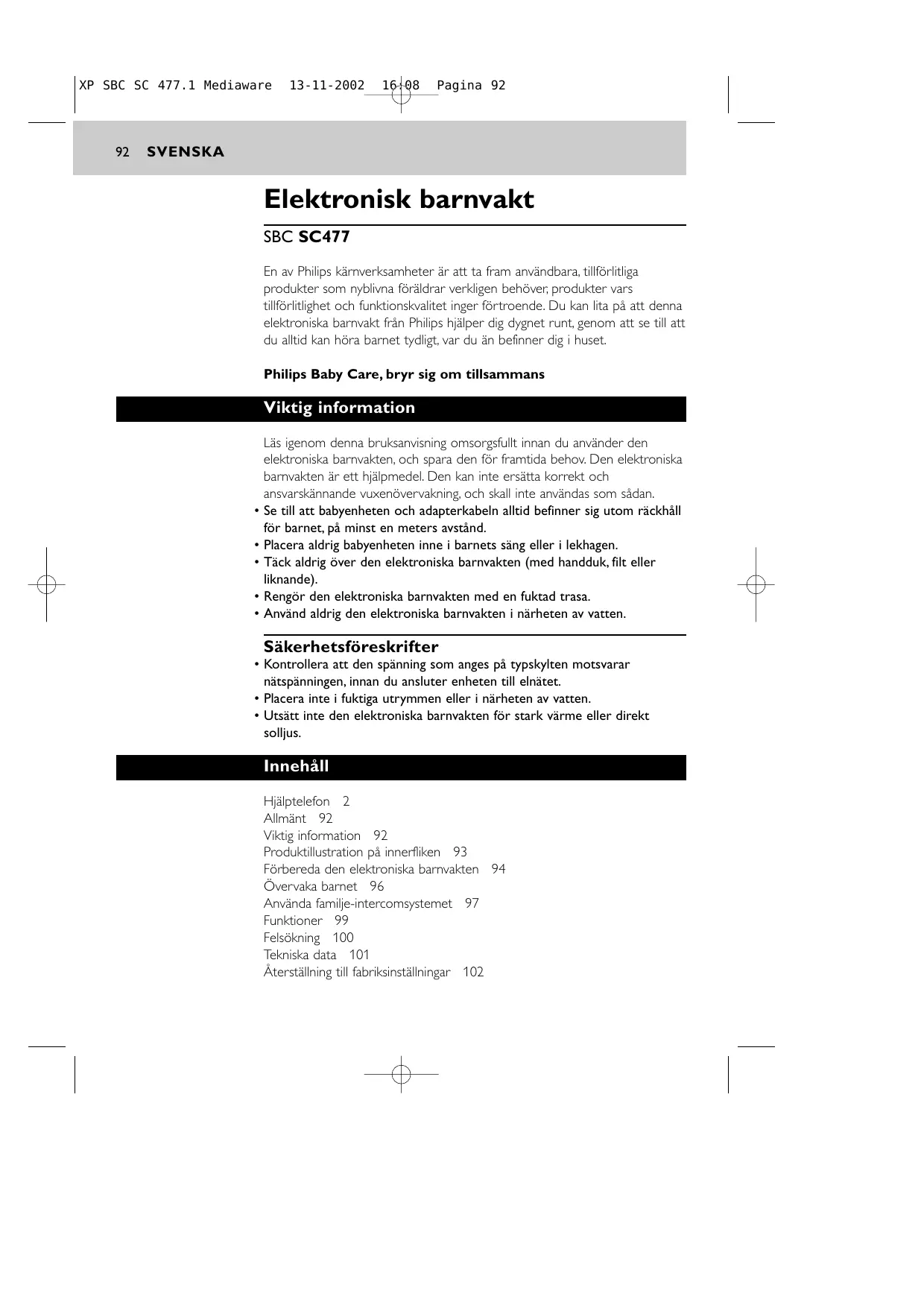 - Utsätt inte den elektroniska barnvakten för stark värme eller direkt solljus. Innehåll Hjälptelefon 2 Allmänt 92 Viktig information 92 Produktillustration på innerfliken 93 Förbereda den elektroniska barnvakten 94 Övervaka barnet 96 Använda familje-intercomsystemet 97 Funktioner 99 Felsökning 100 Tekniska data 101 Återställning till fabriksinställningar 102 XP SBC SC 477.1 Mediaware 13-11-2002 16:08 Pagina 93 SVENSKA