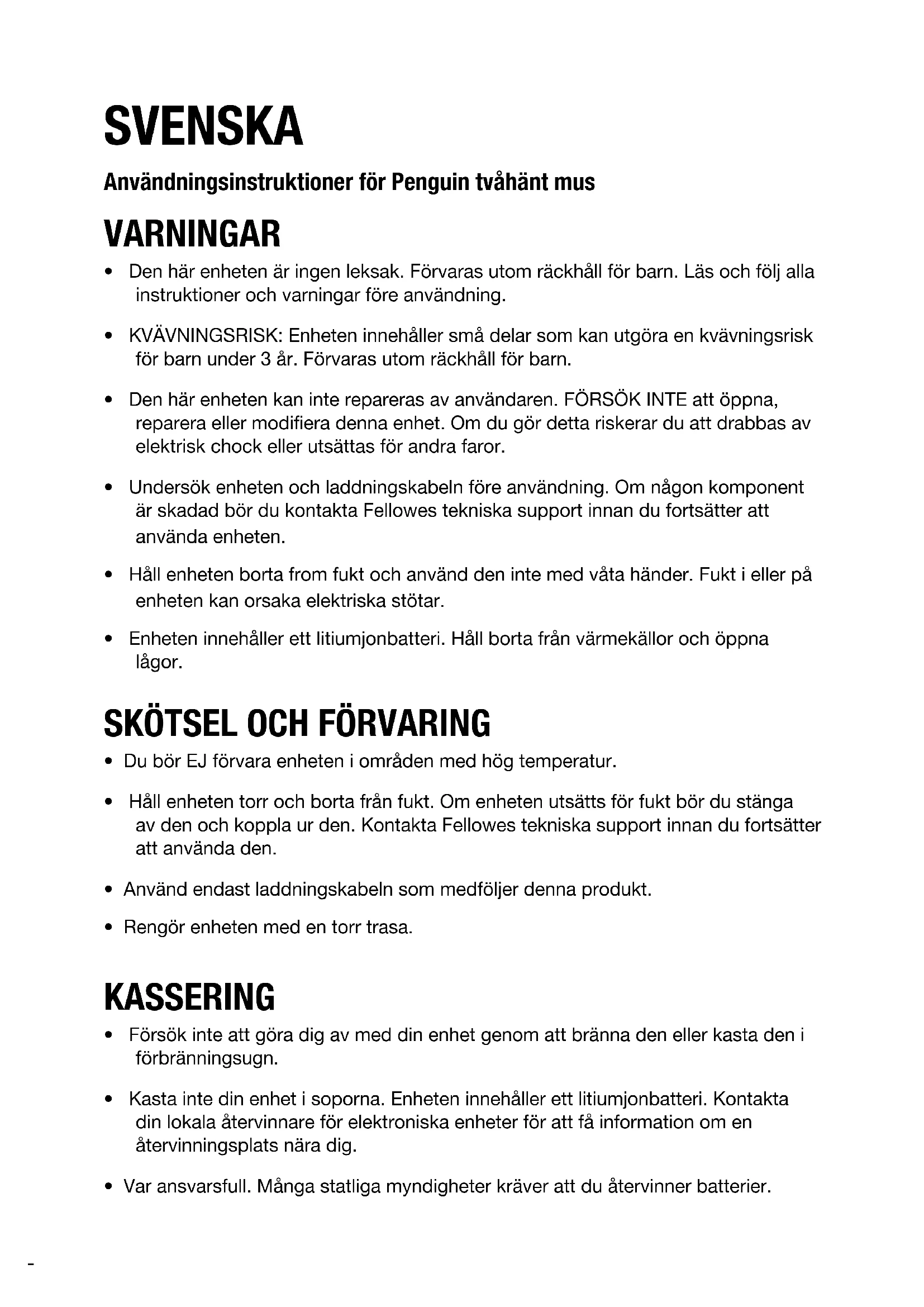 - Testa din Penguin-mus på en annan PC/laptop och se om problemet fortfarande kvarstår.VIKTIG INFORMATION Hälsa Om du spenderar långa tidsperioder framför din arbetsstation utan att ta regelbundna raster kan detta göra att du känner dig dålig. Om du fortsätter att känna dig dålig bör du uppsöka kvalificerad läkarhjälp. Råd/underhållsinformation för användare Undvik kontakt med starka krämer/desinfektionsmedel av medicinell karaktär när du använder Penguin-musen. Försök att avlägsna damm regelbundet från din undersida av din Penguin-mus för att se till att musen glider runt smidigt. Friskrivningsklausul Vi kommer att göra vårt yttersta för att se till att informationen och förfarandena i den här vägledningen är korrekta och fullständiga. Vi accepterar inget ansvar för fel eller försummelser, och förbehåller oss härmed rätten att göra ändringar av vilket som helst slag utan något varsel om detta. 2 års garanti för Fellowes Penguin tvåhänt vertikal mus Fellowes, Inc. ("Företaget") garanterar att denna produkt är fri från brister avseende material och utförande, som visar sig inom två (2) år från produktens ursprungliga inköpsdatum. Om en sådan defekt uppkommer under garantiperioden så kommer Bolaget att (efter eget val) antingen reparera eller ersätta den defekta produkten utan kostnad för service eller delar, eller återbetala inköpspriset. Företaget kan kräva att produkten ska återlämnas till en plats som bestäms av Kundtjänst, på kundens bekostnad. Garantin gäller endast den ursprungliga inköparen och täcker ej anspråk som uppstår till följd av missbruk, underlåtenhet att följa instruktionerna vid installation och användning, försummelse, användning av ej godkända tillbehör, kommersiell användning, användning vid en strömstyrka eller spänning som ej motsvarar den som specificeras på produkten, eller obehörig service under garantiperioden på villkor som i övrigt täcks av garanti.LÄNGDEN PÅ EVENTUELLA UNDERFÖRSTÅDDA GARANTIER, DÄRIBLAND