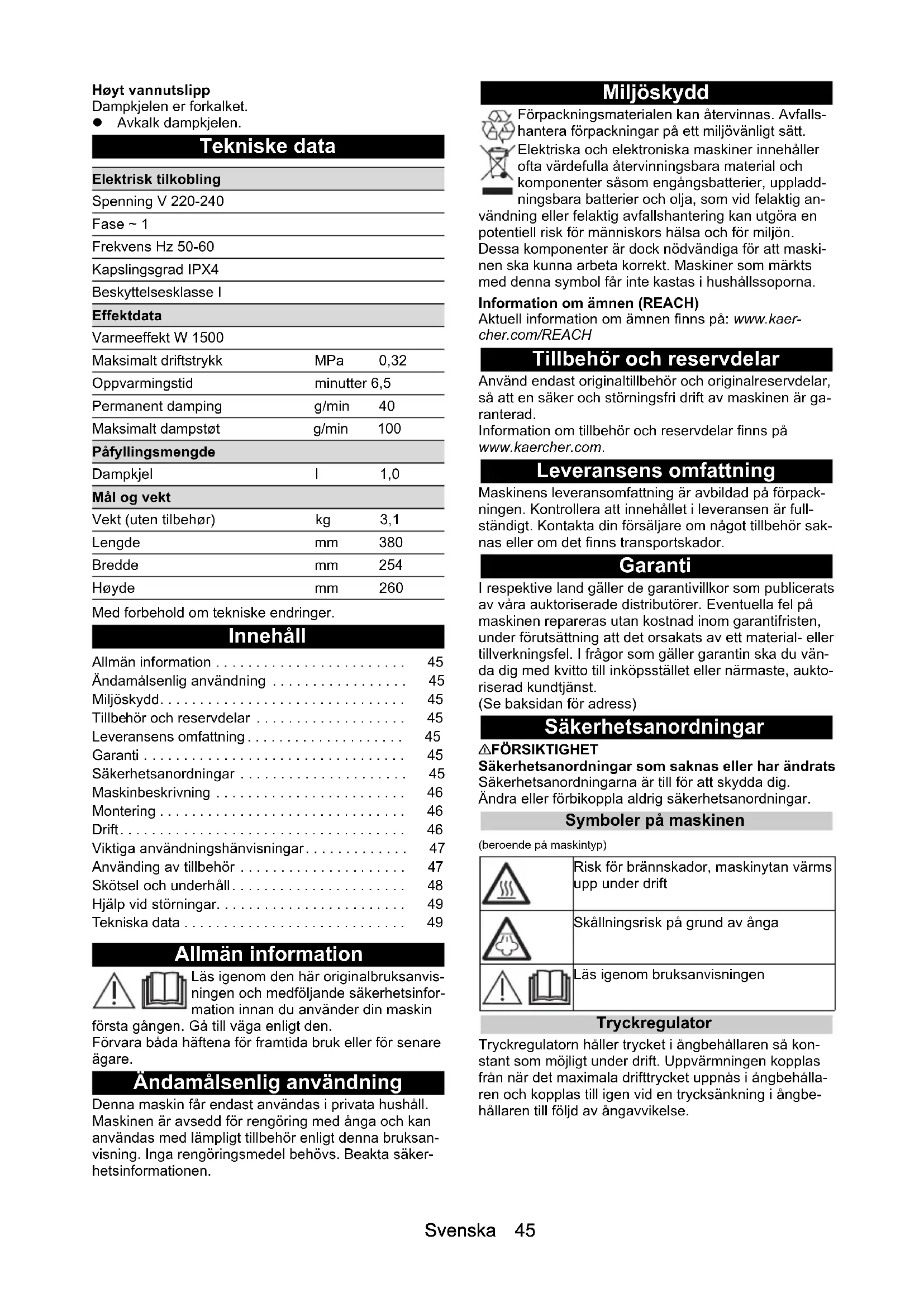 - 60 °C i vaskemaskinen. Utbedring av feil Feil har oftest enkle årsaker som du selv kan utbedre ved hjelp av følgende oversikt. I tvilstilfeller, eller ved driftsforstyrrelser som ikke er nevnt her, kan du kontakte vår autoriserte kundeservice. 몇 ADVARSEL Fare for elektrisk støt og forbrenning Så lange apparatet er koblet til strømnettet eller fremde- les ikke er avkjølt, er det farlig å utbedre feil. Trekk ut strømstøpselet. La apparatet avkjøles. Dampkjelen er forkalket. Avkalk dampkjelen. Ingen damp Ikke noe vann i dampkjelen Etterfyll vann, se kapittel Etterfylle vann. Det er ikke mulig å trykke damparmen Damparmen er sikret med barnesikringen. Still barnesikringen (valgbryteren for dampmeng- den) forover. Damparmen er låst opp. Lang oppvarmingstid Dampkjelen er forkalket. Avkalk dampkjelen. Høyt vannutslipp Dampkjelen er for full. Trykk på damppistolen helt til det kommer ut mindre vann. Hardhetsområde °dH mmol/l KF I mykt 0-7 0-1,3 55 II middels 7-14 1,3-2,5 45 III hardt 14-21 2,5-3,8 35 IV svært hardt >21 >3,8 25Svenska 45 Høyt vannutslipp Dampkjelen er forkalket. Avkalk dampkjelen. Tekniske data Med forbehold om tekniske endringer. Innehåll Allmän information Läs igenom den här originalbruksanvis- ningen och medföljande säkerhetsinfor- mation innan du använder din maskin första gången. Gå till väga enligt den. Förvara båda häftena för framtida bruk eller för senare ägare. Ändamålsenlig användning Denna maskin får endast användas i privata hushåll. Maskinen är avsedd för rengöring med ånga och kan användas med lämpligt tillbehör enligt denna bruksan- visning. Inga rengöringsmedel behövs. Beakta säker- hetsinformationen. Miljöskydd Förpackningsmaterialen kan återvinnas. Avfalls- hantera förpackningar på ett miljövänligt sätt. Elektriska och elektroniska maskiner innehåller ofta värdefulla återvinningsbara material och komponenter såsom engångsbatterier, uppladd- ningsbara batterier och olja, som vid felaktig an- vändning eller felaktig avfallshantering kan utgöra en potentiell risk för människors hälsa och för miljön. Dessa komponenter är dock nödvändiga för att maski- nen ska kunna arbeta korrekt. Maskiner som märkts med denna symbol får inte kastas i hushållssoporna. Information om ämnen (REACH) Aktuell information om ämnen finns på: www.kaer- cher.com/REACH Tillbehör och reservdelar Använd endast originaltillbehör och originalreservdelar, så att en säker och störningsfri drift av maskinen är ga- ranterad. Information om tillbehör och reservdelar finns på www.kaercher.com. Leveransens omfattning Maskinens leveransomfattning är avbildad på förpack- ningen. Kontrollera att innehållet i leveransen är full- ständigt. Kontakta din försäljare om något tillbehör sak- nas eller om det finns transportskador. Garanti I respektive land gäller de garantivillkor som publicerats av våra auktoriserade distributörer. Eventuella fel på maskinen repareras utan kostnad inom garantifristen, under förutsättning att det orsakats av ett material- eller tillverkningsfel. I frågor som gäller garantin ska du vän- da dig med kvitto till inköpsstället eller närmaste, aukto- riserad kundtjänst. (Se baksidan för adress) Säkerhetsanordningar 몇 FÖRSIKTIGHET Säkerhetsanordningar som saknas eller har ändrats Säkerhetsanordningarna är till för att skydda dig. Ändra eller förbikoppla aldrig säkerhetsanordningar. Symboler på maskinen (beroende på maskintyp) Tryckregulator Tryckregulatorn håller trycket i ångbehållaren så kon- stant som möjligt under drift. Uppvärmningen kopplas från när det maximala drifttrycket uppnås i ångbehålla- ren och kopplas till igen vid en trycksänkning i ångbe- hållaren till följd av ångavvikelse. Elektrisk tilkobling Spenning V 220-240 Fase ~ 1 Frekvens Hz 50-60 Kapslingsgrad IPX4 Beskyttelsesklasse I Effektdata Varmeeffekt W 1500 Maksimalt driftstrykk MPa 0,32 Oppvarmingstid minutter 6,5 Permanent damping g/min 40 Maksimalt dampstøt g/min 100 Påfyllingsmengde Dampkjel l 1,0 Mål og vekt Vekt (uten tilbehør) kg 3,1 Lengde mm 380 Bredde mm 254 Høyde mm 260 Allmän information p. 45