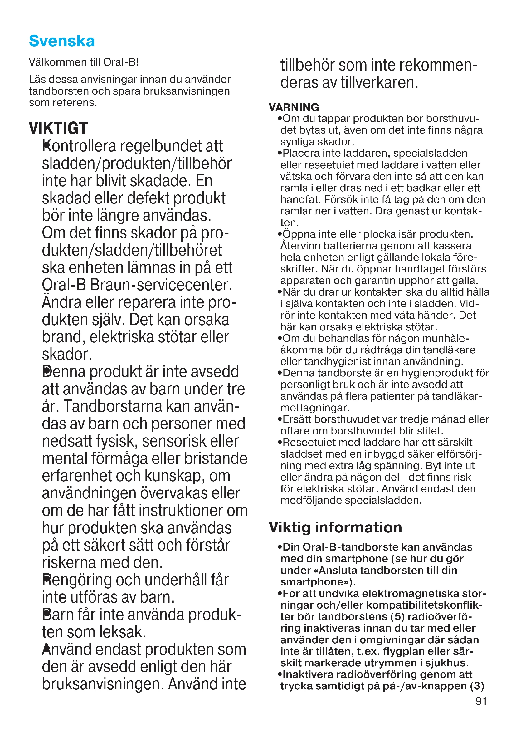 Denna produit ar inte avsedd att anvandas av barn under tre ar. Tandborstarna kan anvandas av barn och personer med nedsatt fysisik, sensorisk eller mental formaga aller bristande erfarenhet och kunskap, om användningen overvakas ull om de har fatt instruktioner om hurprodukten ska anvandas på ett sakert satt och forstar riskerna med den.