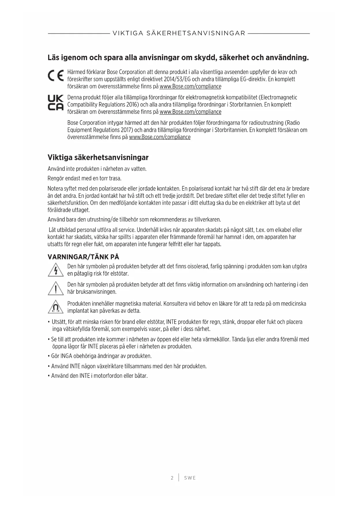 Denna produit foljer alla tillampliga fororderingar for elektromagnetisk kompatilitet (Electromagnetic Compatibility Regulations 2016) och alla andra tillampliga fororderingar i Storbritannien. En komplett forsakran om overensstammelse finns pa www.Bose.com/compliance
