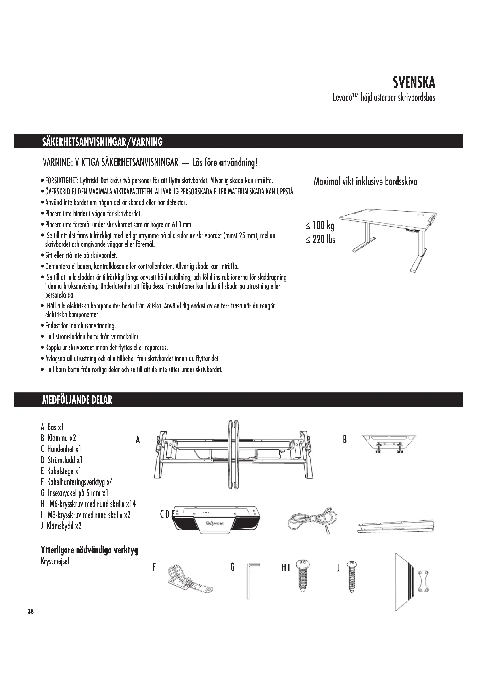 VARNING: VIKTIGA SÄKERHETSANVISNINGAR — Läs före användning! ≤ 220 lbs Maximal vikt inklusive bordsskiva ≤ 100 kg A Bas x1 B Klämma x2 C Handenhet x1 D Strömsladd x1 E Kabelstege x1 F Kabelhanteringsverktyg x4 G Insexnyckel på 5 mm x1 H M6-krysskruv med rund skalle x14 I M3-krysskruv med rund skalle x2 J Klämskydd x2 Ytterligare nödvändiga verktyg Kryssmejsel