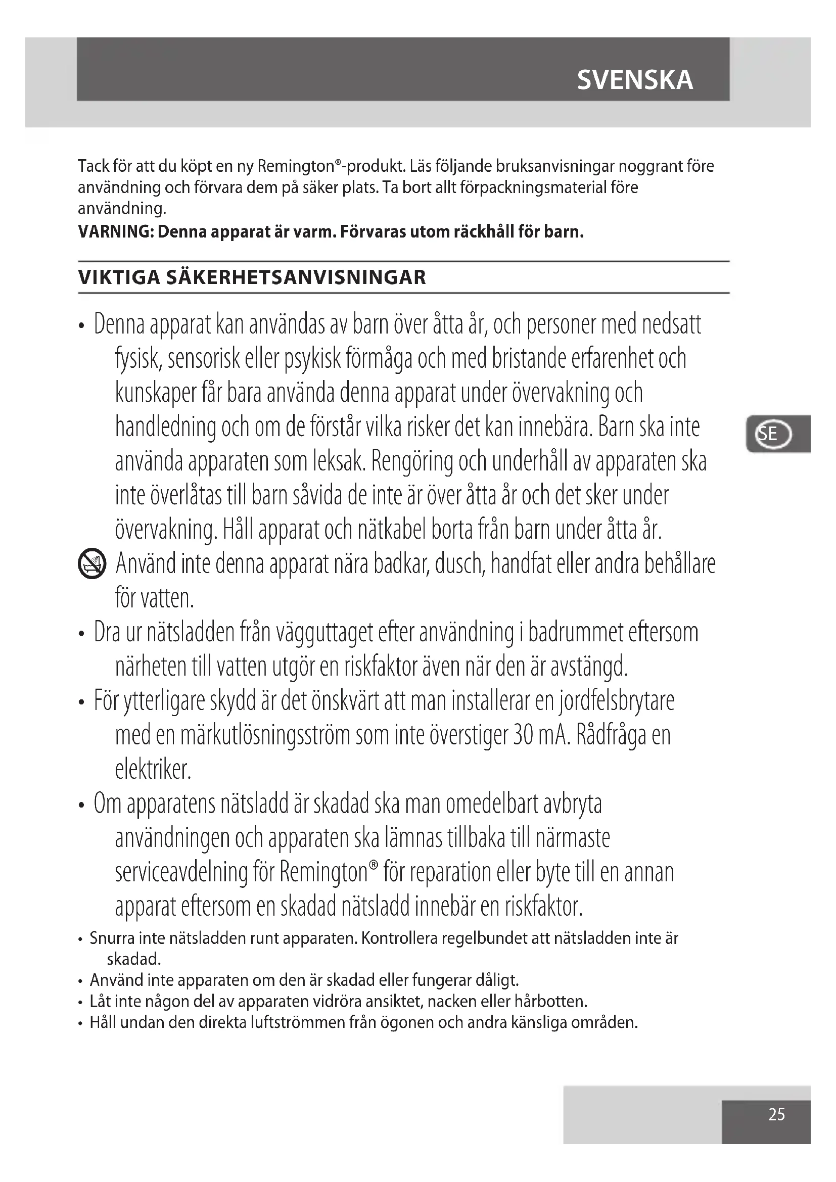 Tack för att du köpt en ny Remington®-produkt. Läs följande bruksanvisningar noggrant före användning och förvara dem på säker plats. Ta bort allt förpackningsmaterial före användning. VARNING: Denna apparat är varm. Förvaras utom räckhåll för barn.