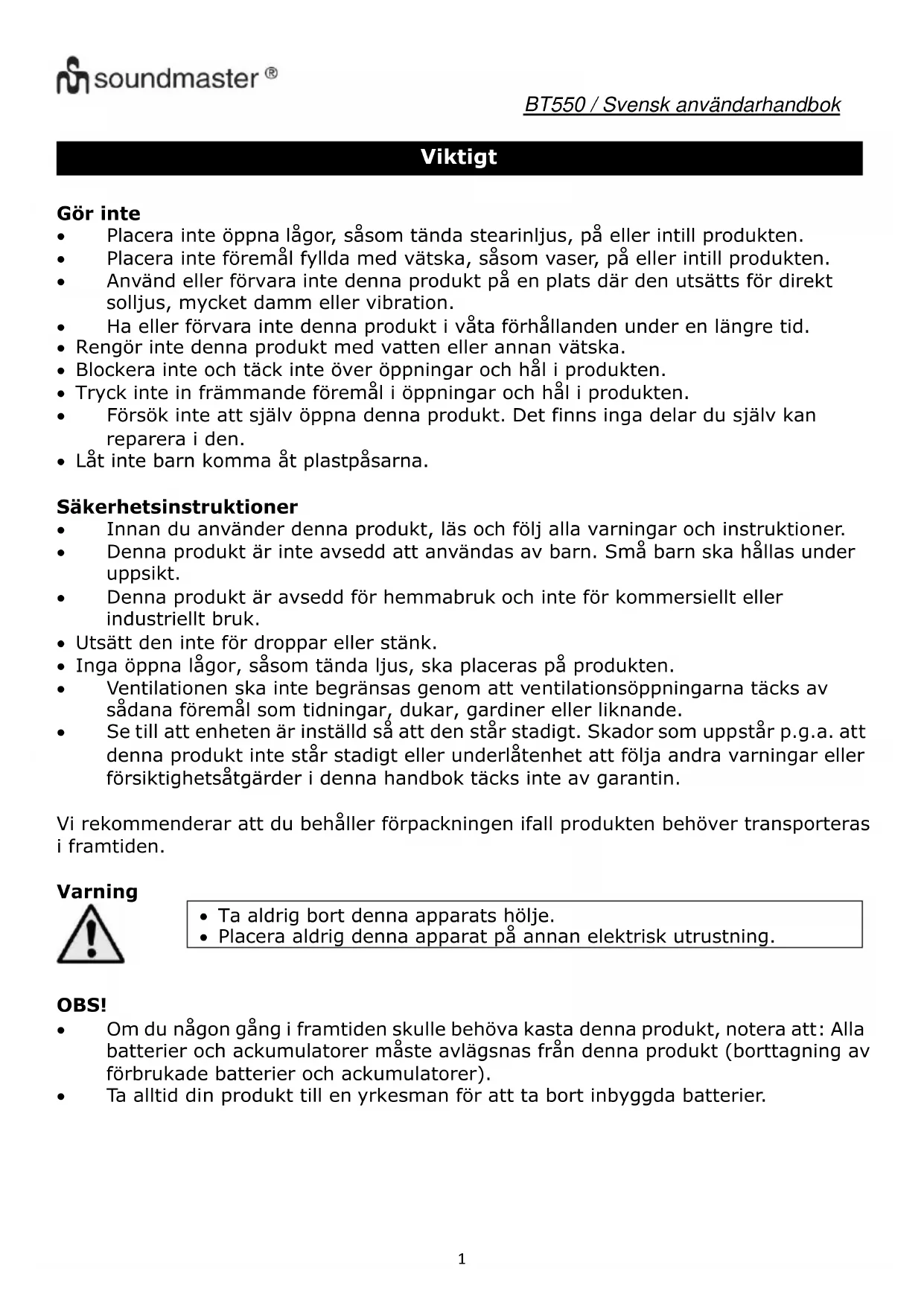 Hitta enhetens manual gratis BT550 Soundmaster i PDF-format.