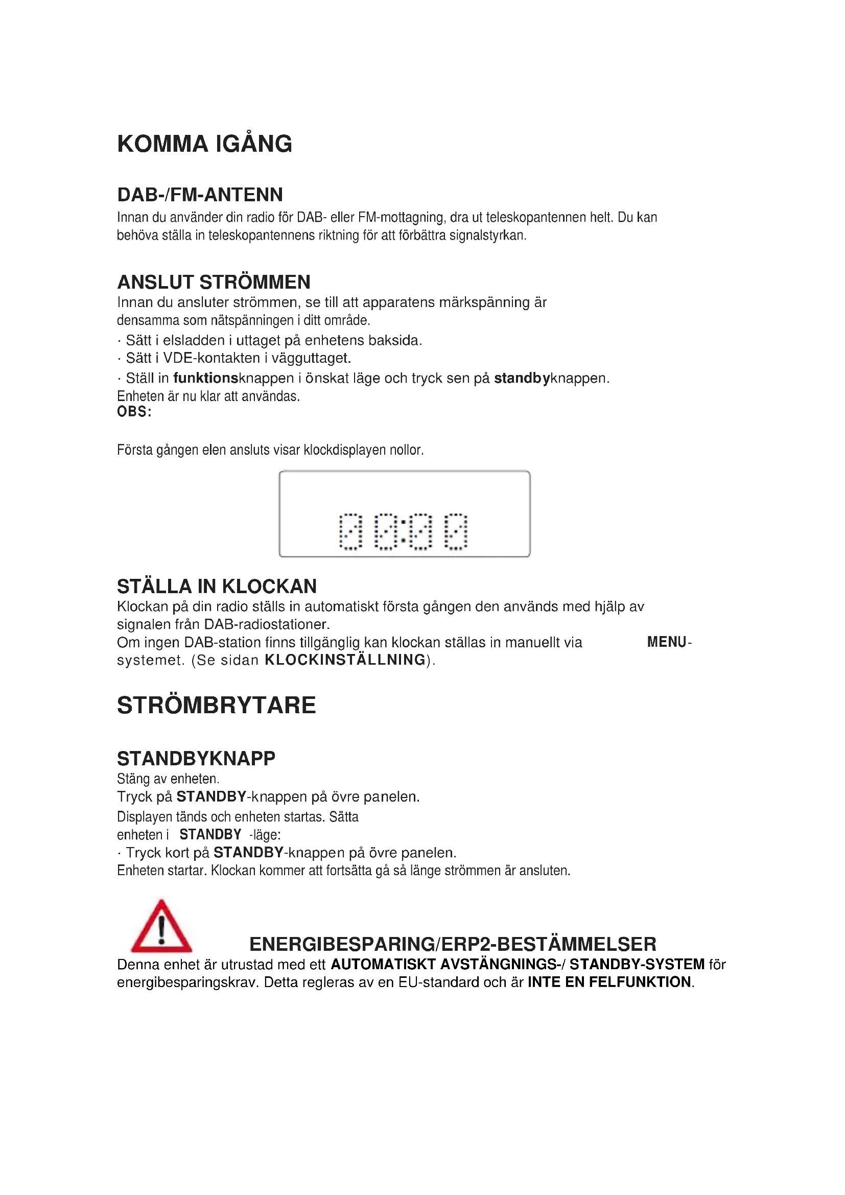 Denna enhet är utrustad med ett AUTOMATISKT AVSTÄNGNINGS-/ STANDBY-SYSTEM för energibesparingskrav. Detta regleras av en EU-standard och är INTE EN FELFUNKTION.INLEDANDE SKANNING När denna enhet startas för första gången i INSTÄLLNINGS-läge, tryck då på knappen MODE och växla till DAB. Skanningsdisplayen kommer att visas under tiden som skanningen pågår: