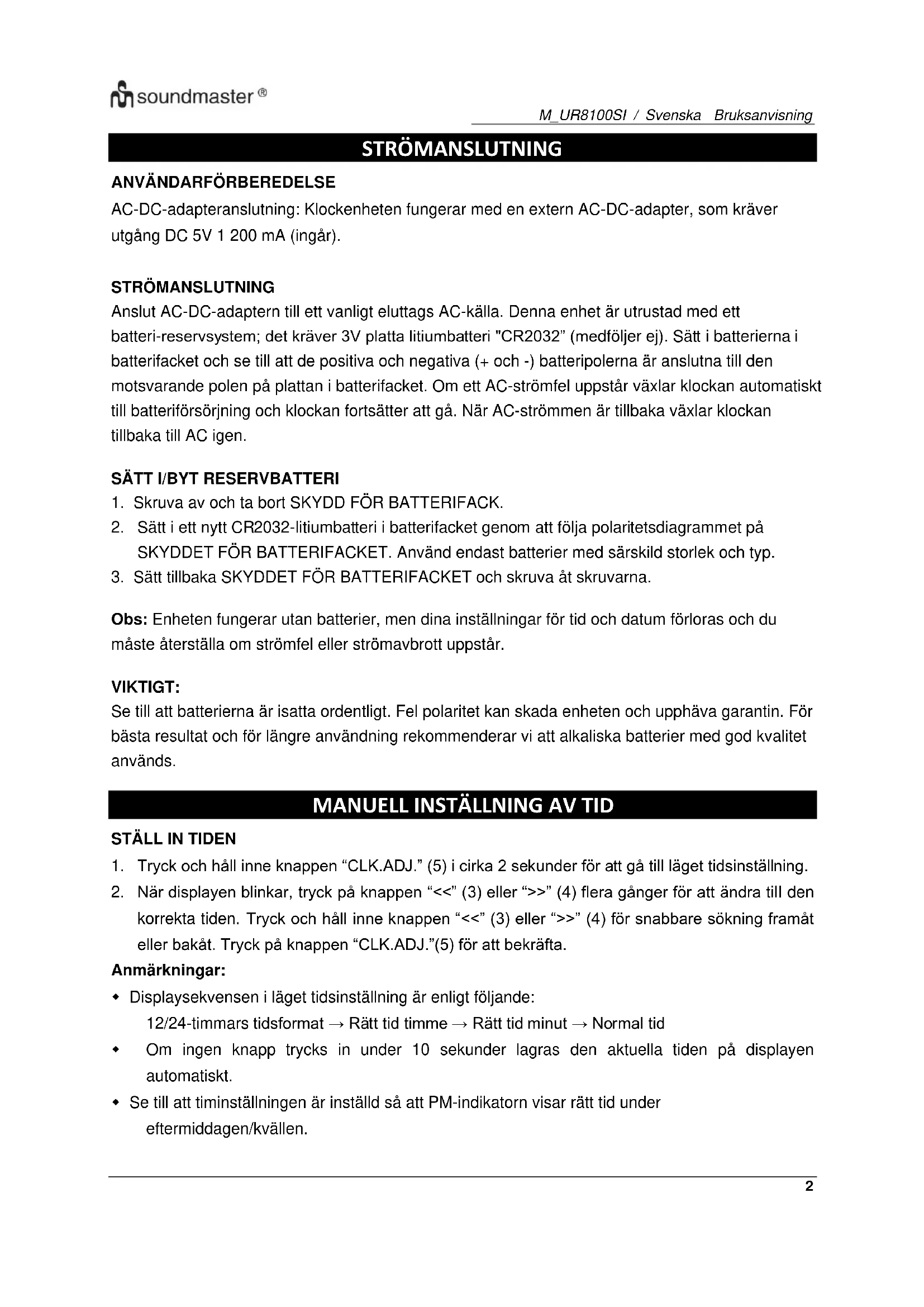 BRUKSANVISNING UR8100SI Soundmaster