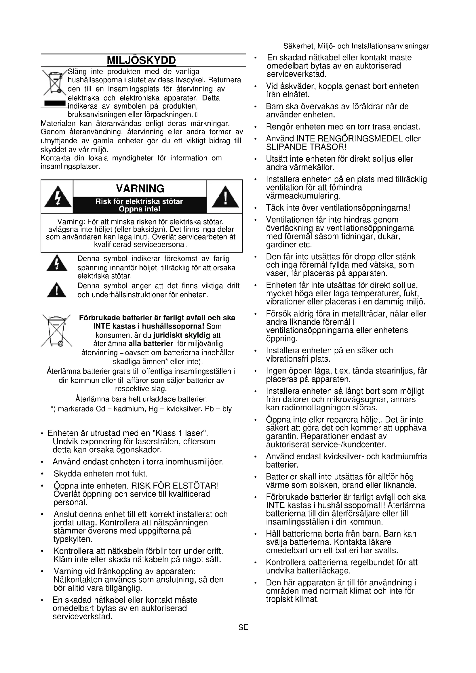 Sakerhet, Miljo- och Installationsanvisningar