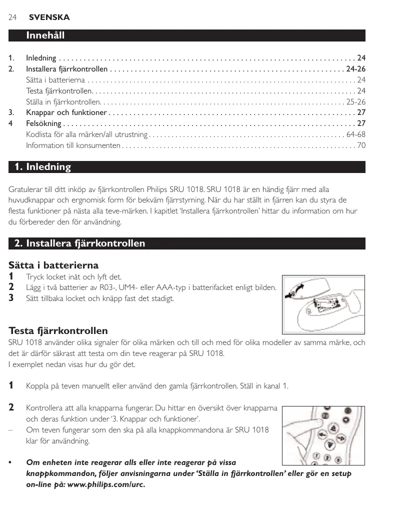 Gratulerar till ditt inköp av fjärrkontrollen Philips SRU 1018. SRU 1018 är en händig fjärr med alla huvudknappar och ergnomisk form för bekväm fjärrstyrning. När du har ställt in fjärren kan du styra de flesta funktioner på nästa alla teve-märken. I kapitlet ‘Installera fjärrkontrollen’ hittar du information om hur du förbereder den för användning.