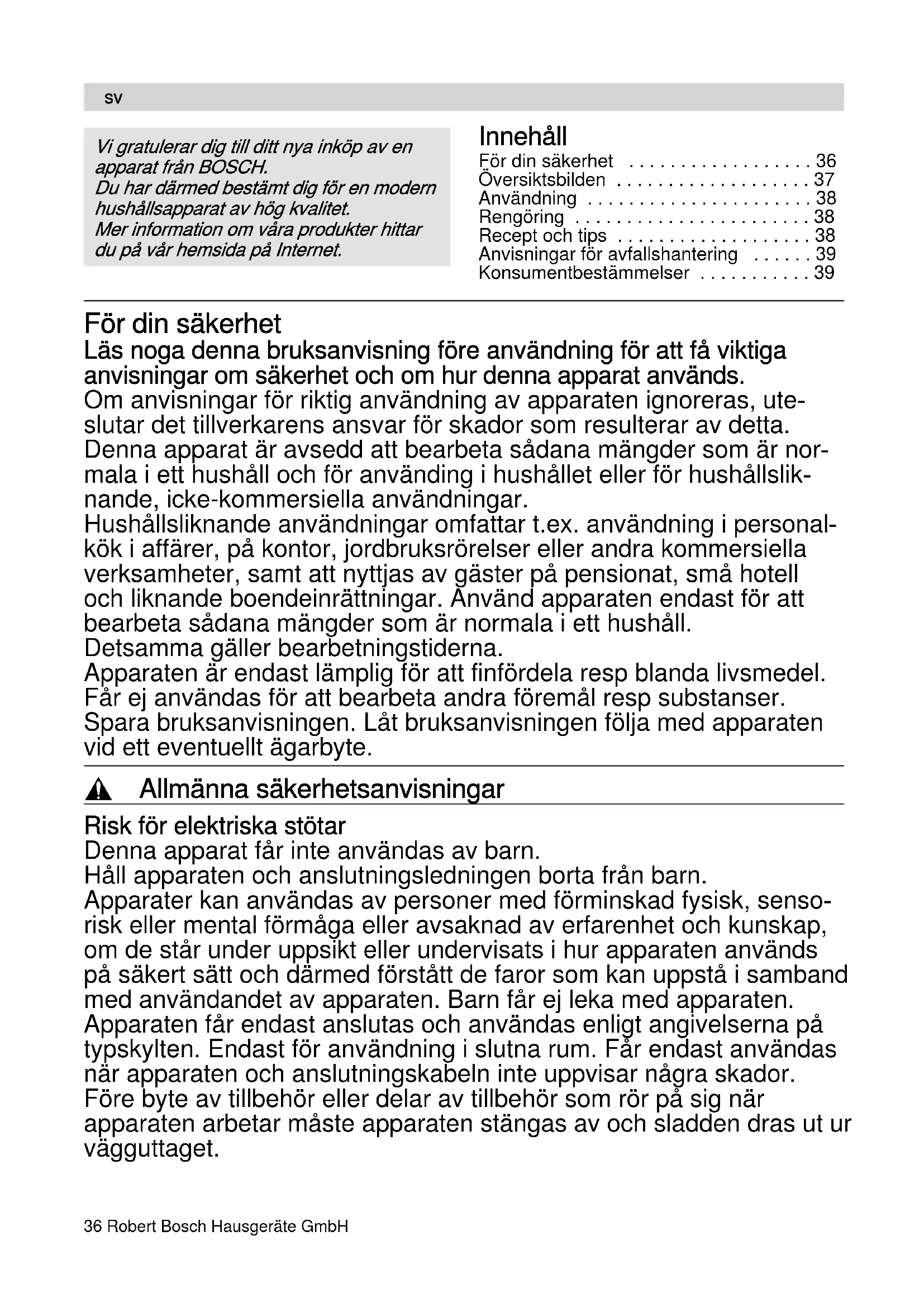 Vi gratulerar dig till ditt nya inköp av en apparat från BOSCH. Du har därmed bestämt dig för en modern hushållsapparat av hög kvalitet. Mer information om våra produkter hittar du på vår hemsida på Internet.Robert Bosch Hausgeräte GmbH 37 Stickkontakten måste alltid vara utdragen ur vägguttaget när appa- raten lämnas utan uppsikt och innan den ska monteras, tas isär eller rengöras. Låt inte anslutningskabeln ligga över vassa kanter eller heta ytor. Om anslutningskabeln av denna apparat skulle skadas får den bytas ut av tillverkaren eller dennes kundtjänst eller en liknande kvalificerad person, för att undvika risker. Reparationer på apparaten får endast utföras av vår kundtjänst. , Säkerhetsanvisningar för denna apparat Risk för skada Risk för elektriska stötar Använd inte stavmixern med fuktiga händer och låt den inte gå på tomgång. Doppa inte apparaten i vätska över det ställe där mixerfoten sätts in i motordelen. Doppa aldrig motordelen i vätskor och rengör den inte i diskmaskinen. Var försiktig när heta vätskor bearbetas. Vätskor kan stänka när de bearbetas. Placera aldrig mixerfoten på heta ytor och använd den heller inte i mycket het mixerblandning. Låt heta mixerblandningar svalna till minst 80 °C före bearbetning med mixern! När stavmixern ska använ- das i en kastrull ska kastrullen först lyftas bort från spisplattan/hällen. Använd stavmixern endast tillsammans med originaltillbehör. Verktyg får endast sättas fast och lossas när apparaten står stilla. Vi rekommenderar, att apparaten aldrig är påslagen längre tid än som behövs för att bearbeta livsmedlen. Mixerbägaren är ej lämplig för användning i mikrovågsugn. Risk för skada pga vassa knivar/roterande drivuttag! Stoppa aldrig in fingrarna i kniven i mixerfoten. Rengör aldrig kniven med bara händerna. Använd en borste. I denna bruksanvisning beskrivas olika modeller. På bildsidorna finns en översikt över de olika modellerna (bild