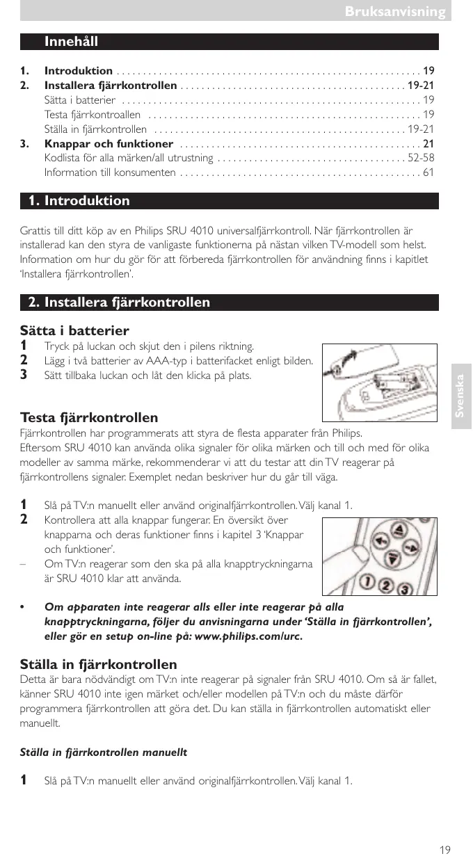 Introduktion . . . . . . . . . . . . . . . . . . . . . . . . . . . . . . . . . . . . . . . . . . . . . . . . . . . . . . . . . . 19 Installera fjärrkontrollen . . . . . . . . . . . . . . . . . . . . . . . . . . . . . . . . . . . . . . . . . . . 19-21 Sätta i batterier . . . . . . . . . . . . . . . . . . . . . . . . . . . . . . . . . . . . . . . . . . . . . . . . . . . . . . . . . 19 Testa fjärrkontroallen . . . . . . . . . . . . . . . . . . . . . . . . . . . . . . . . . . . . . . . . . . . . . . . . . . . . 19 Ställa in fjärrkontrollen . . . . . . . . . . . . . . . . . . . . . . . . . . . . . . . . . . . . . . . . . . . . . . . . 19-21 Knappar och funktioner . . . . . . . . . . . . . . . . . . . . . . . . . . . . . . . . . . . . . . . . . . . . . . 21 Kodlista för alla märken/all utrustning . . . . . . . . . . . . . . . . . . . . . . . . . . . . . . . . . . . . 52-58 Information till konsumenten . . . . . . . . . . . . . . . . . . . . . . . . . . . . . . . . . . . . . . . . . . . . . . 61