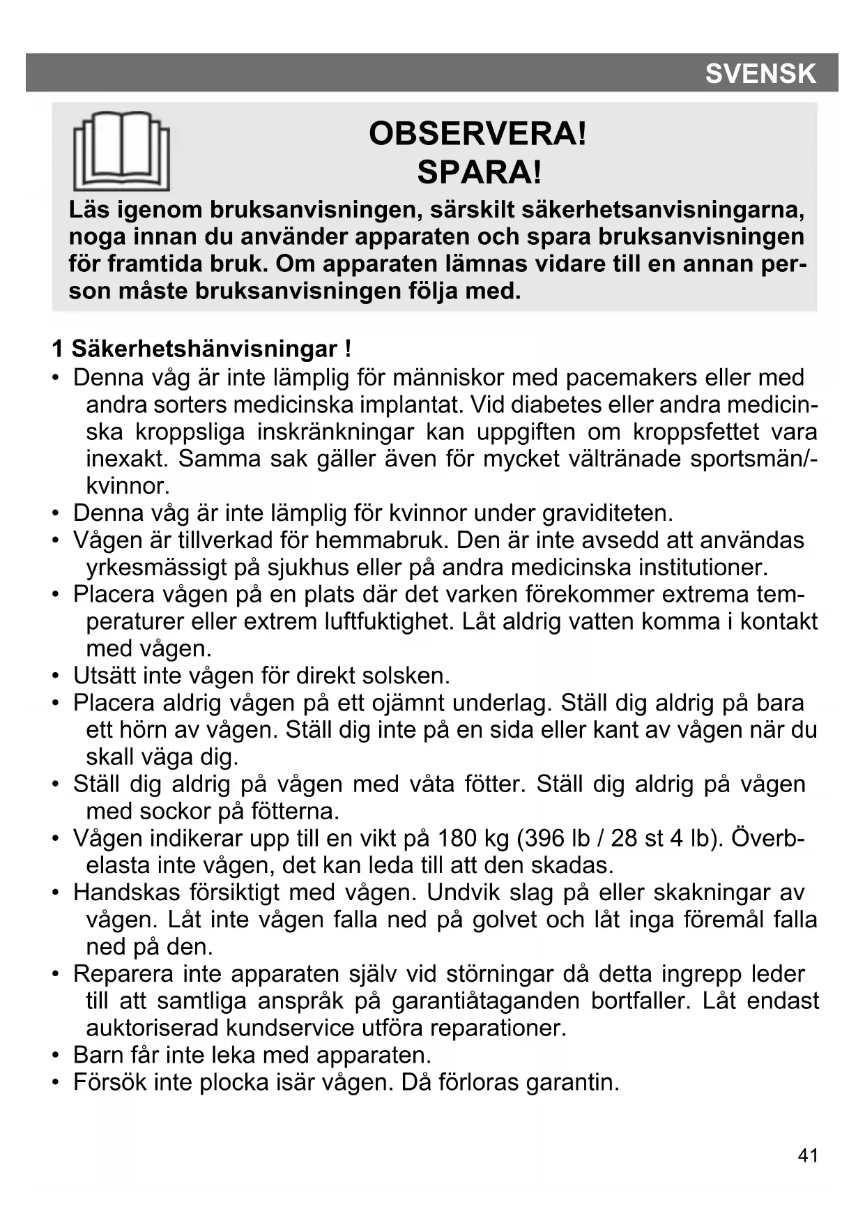 - Försök inte plocka isär vågen. Då förloras garantin.42 SVENSK
