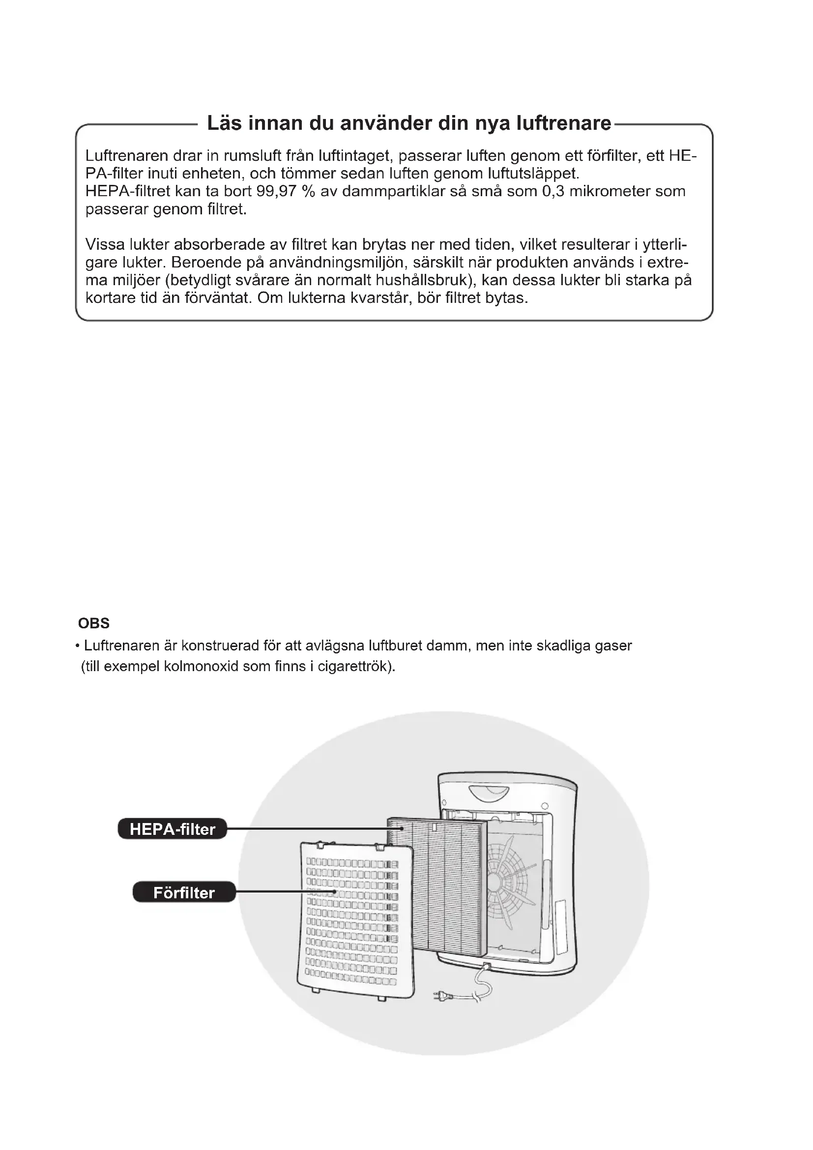Si desea eliminar este producto, póngase en contacto con las autoridades locales para consultar el método correcto de eliminación. Atención: Su producto está marcado con este símbolo, que signica que los productos eléctricos y electrónicos usados no deberían mezclarse con los residuos domésticos generales. Existe un sistema de reco- gida especial para estos productos. OM_FP-F30EU_20161214_WEST.indb 11 2017-02-22 15:15:08Läs innan du använder din nya luftrenare Luftrenaren drar in rumsluft från luftintaget, passerar luften genom ett förlter, ett HE- PA-lter inuti enheten, och tömmer sedan luften genom luftutsläppet. HEPA-ltret kan ta bort 99,97 % av dammpartiklar så små som 0,3 mikrometer som passerar genom ltret. Vissa lukter absorberade av ltret kan brytas ner med tiden, vilket resulterar i ytterli- gare lukter. Beroende på användningsmiljön, särskilt när produkten används i extre- ma miljöer (betydligt svårare än normalt hushållsbruk), kan dessa lukter bli starka på kortare tid än förväntat. Om lukterna kvarstår, bör ltret bytas. OBS