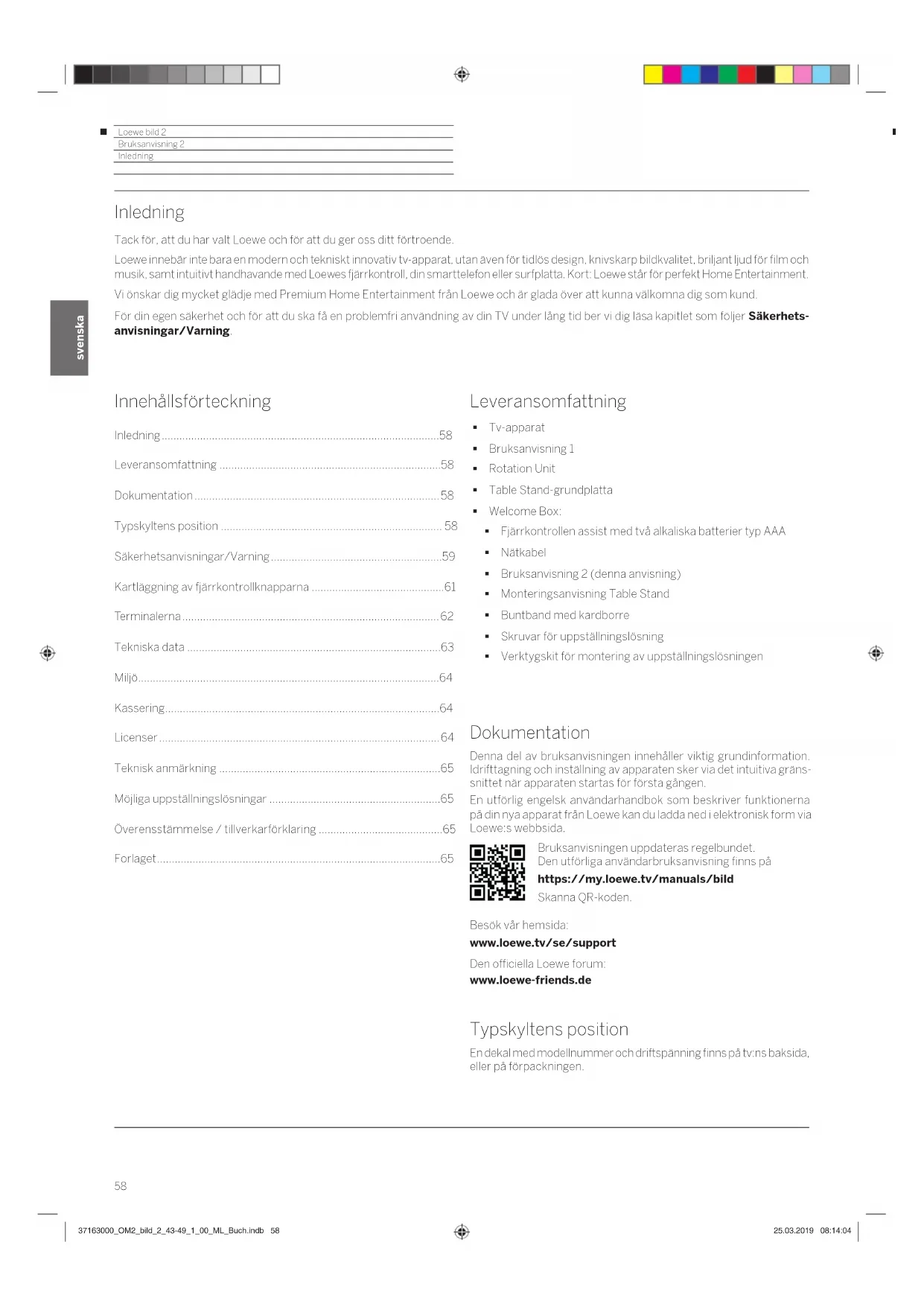 - Inledning Inledning Tack för, att du har valt Loewe och för att du ger oss ditt förtroende. Loewe innebär inte bara en modern och tekniskt innovativ tv-apparat, utan även för tidlös design, knivskarp bildkvalitet, briljant ljud för film och musik, samt intuitivt handhavande med Loewes fjärrkontroll, din smarttelefon eller surfplatta. Kort: Loewe står för perfekt Home Entertainment. Vi önskar dig mycket glädje med Premium Home Entertainment från Loewe och är glada över att kunna välkomna dig som kund. För din egen säkerhet och för att du ska få en problemfri användning av din TV under lång tid ber vi dig läsa kapitlet som följer Säkerhets- anvisningar/Varning. Dokumentation Denna del av bruksanvisningen innehåller viktig grundinformation. Idrifttagning och inställning av apparaten sker via det intuitiva gräns- snittet när apparaten startas för första gången. En utförlig engelsk användarhandbok som beskriver funktionerna på din nya apparat från Loewe kan du ladda ned i elektronisk form via Loewe:s webbsida. Bruksanvisningen uppdateras regelbundet. Den utförliga användarbruksanvisning finns på https://my.loewe.tv/manuals/bild Skanna QR-koden. Besök vår hemsida: www.loewe.tv/se/support Den officiella Loewe forum: www.loewe-friends.de Typskyltens position En dekal med modellnummer och driftspänning finns på tv:ns baksida, eller på förpackningen. Leveransomfattning Tv-apparat Bruksanvisning 1 Rotation Unit Table Stand-grundplatta Welcome Box: Fjärrkontrollen assist med två alkaliska batterier typ AAA Nätkabel Bruksanvisning 2 (denna anvisning) Monteringsanvisning Table Stand Buntband med kardborre Skruvar för uppställningslösning Verktygskit för montering av uppställningslösningen Innehållsförteckning Inledning p. 58