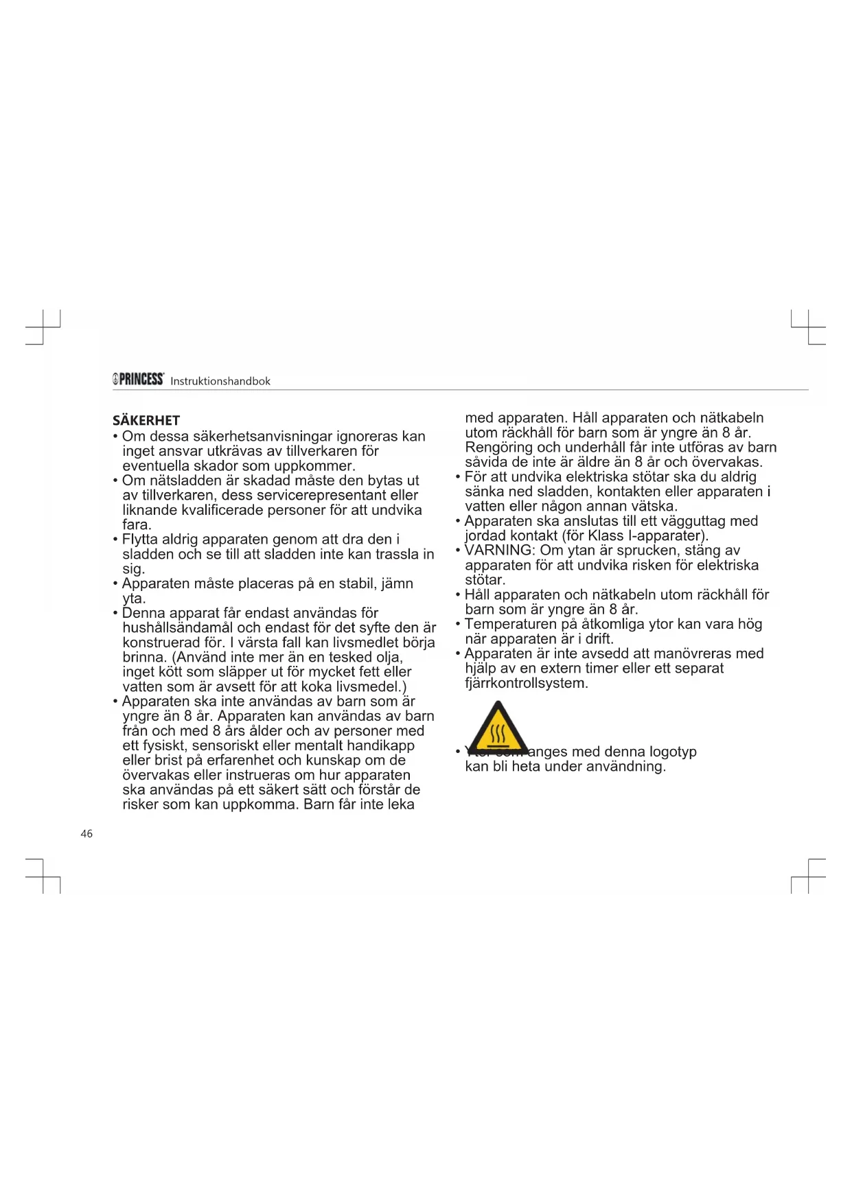 - Rengör apparaten med en fuktig trasa. Använd aldrig starka eller slipande rengöringsmedel, kökssvampar (av Scotch-Brite-typ) eller stålull. Sådana artiklar skadar apparaten. OMGIVNING Denna apparat ska ej slängas bland vanligt hushållsavfall när den slutat fungera. Den ska slängas vid en återvinningsstation för elektriskt och elektroniskt hushållsavfall. Denna symbol på apparaten, bruksanvisningen och förpackningen gör dig uppmärksam på detta. Materialen som används i denna apparat kan återvinnas. Genom att återvinna hushållsapparater gör du en viktig insats för att skydda vår miljö. Fråga de lokala myndigheterna var det finns insamlingsställen. Support Du hittar all tillgänglig information och reservdelar på www.princesshome.eu! SVInstrukcje użytkowania