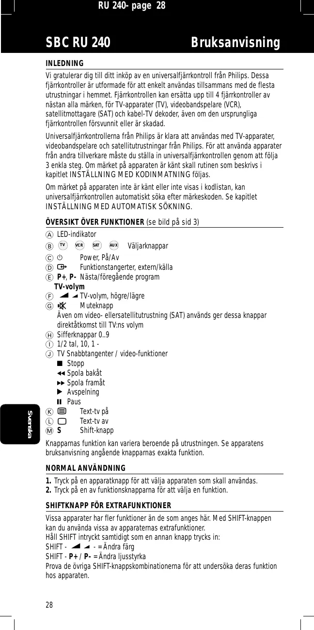 TV VCR Knapparnas funktion kan variera beroende på utrustningen. Se apparatens bruksanvisning angående knapparnas exakta funktion. NORMAL ANVÄNDNING 1. Tryck på en apparatknapp för att välja apparaten som skall användas. 2. Tryck på en av funktionsknapparna för att välja en funktion. SHIFTKNAPP FÖR EXTRAFUNKTIONER Vissa apparater har fler funktioner än de som anges här. Med SHIFT-knappen kan du använda vissa av apparaternas extrafunktioner. Håll SHIFT intryckt samtidigt som en annan knapp trycks in: SHIFT - = Ändra färg SHIFT - P+ / P- = Ändra ljusstyrka Prova de övriga SHIFT-knappskombinationerna för att undersöka deras funktion hos apparaten.
