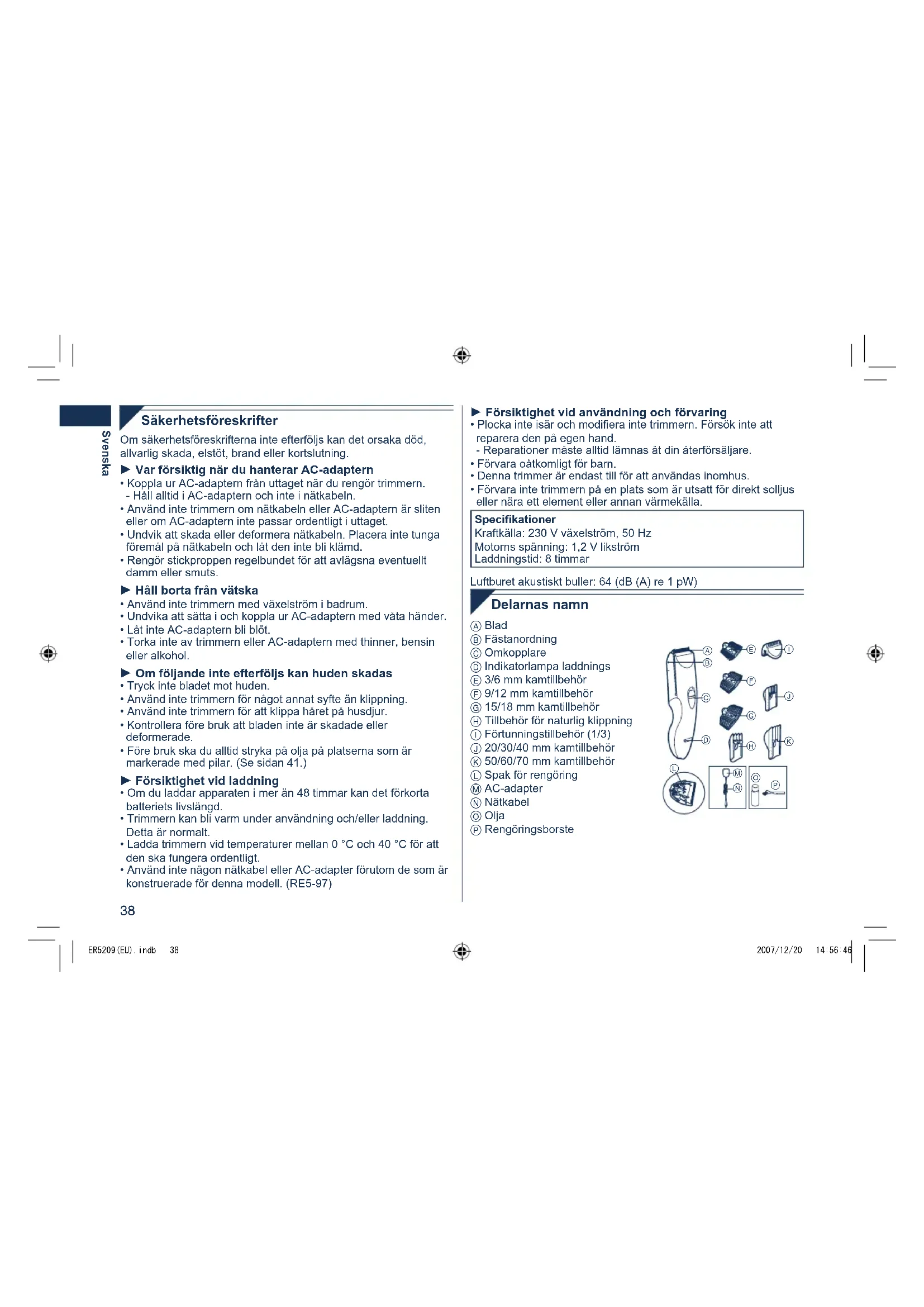 - Använd inte trimmern i bakvänd position. Dettakanklippahåretfördjupt. 1Trimningutantillbehör Omduklipperutantillbehörkommerhåretattklippastill1mmeller mindre. 1.Klipphåretgenomattplacera trimmerhuvudetdirektpåhårbottnen. 1Användningmedväxelström OmduansluterAC-adapterntilltrimmernpåsammasättsomförladdningochställeromkopplarenpå“1”,kanduanvändadenäven om batterikapaciteten är låg.• Om trimmern inte fungerar, ska du ställa omkopplaren på “0•charge”,väntaiungefär1minutochsedanställadenpå“1”igen.•Varförsiktigsåattduinteladdarutbatterietheltmedomkopplarenkvari“1”-positionen.Dettaförkortarbatterietslivslängd. ER5209(EU).indb 40 2007/12/20 14:56:47Svenska