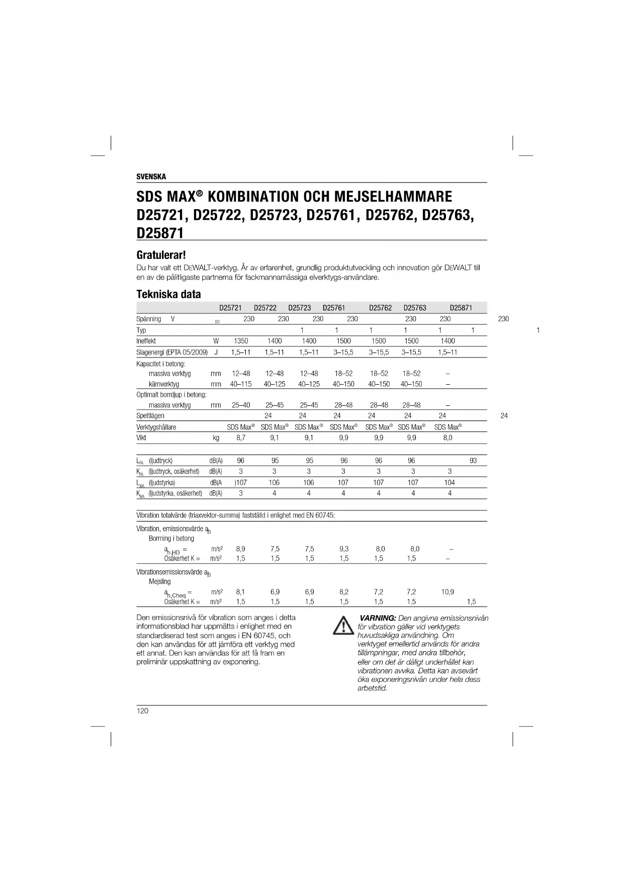 D25721, D25722, D25723, D25761, D25762, D25763, D25871 Gratulerar! Du har valt ett DEWALT-verktyg. År av erfarenhet, grundlig produktutveckling och innovation gör DEWALT till en av de pålitligaste partnerna för fackmannamässiga elverktygs-användare. Tekniska data D25721 D25722 D25723 D25761 D25762 D25763 D25871 Spänning V