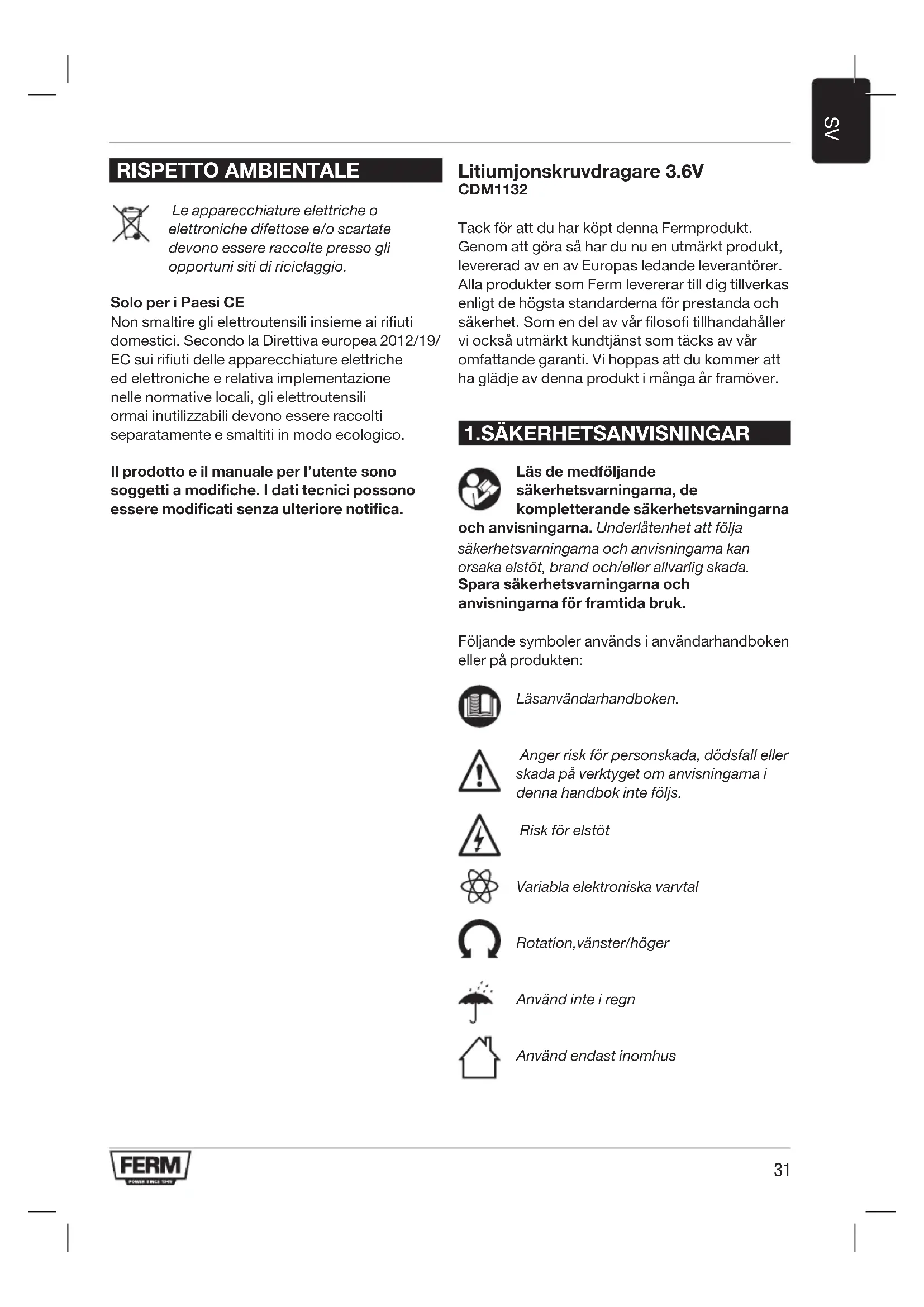 Läs de medföljande säkerhetsvarningarna, de kompletterande säkerhetsvarningarna och anvisningarna. Underlåtenhet att följa säkerhetsvarningarna och anvisningarna kan orsaka elstöt, brand och/eller allvarlig skada. Spara säkerhetsvarningarna och anvisningarna för framtida bruk. Följande symboler används i användarhandboken eller på produkten: Läs användarhandboken. Anger risk för personskada, dödsfall eller skada på verktyget om anvisningarna i denna handbok inte följs. Risk för elstöt Variabla elektroniska varvtal Rotation, vänster/höger Använd inte i regn Använd endast inomhus32