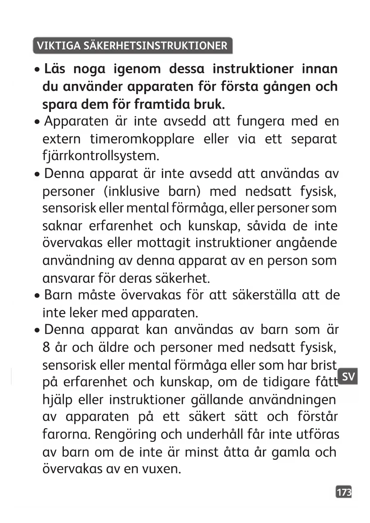- Denna apparat kan användas av barn som är 8 år och äldre och personer med nedsatt fysisk, sensorisk eller mental förmåga eller som har brist på erfarenhet och kunskap, om de tidigare fått hjälp eller instruktioner gällande användningen av apparaten på ett säkert sätt och förstår farorna. Rengöring och underhåll får inte utföras av barn om de inte är minst åtta år gamla och övervakas av en vuxen.174