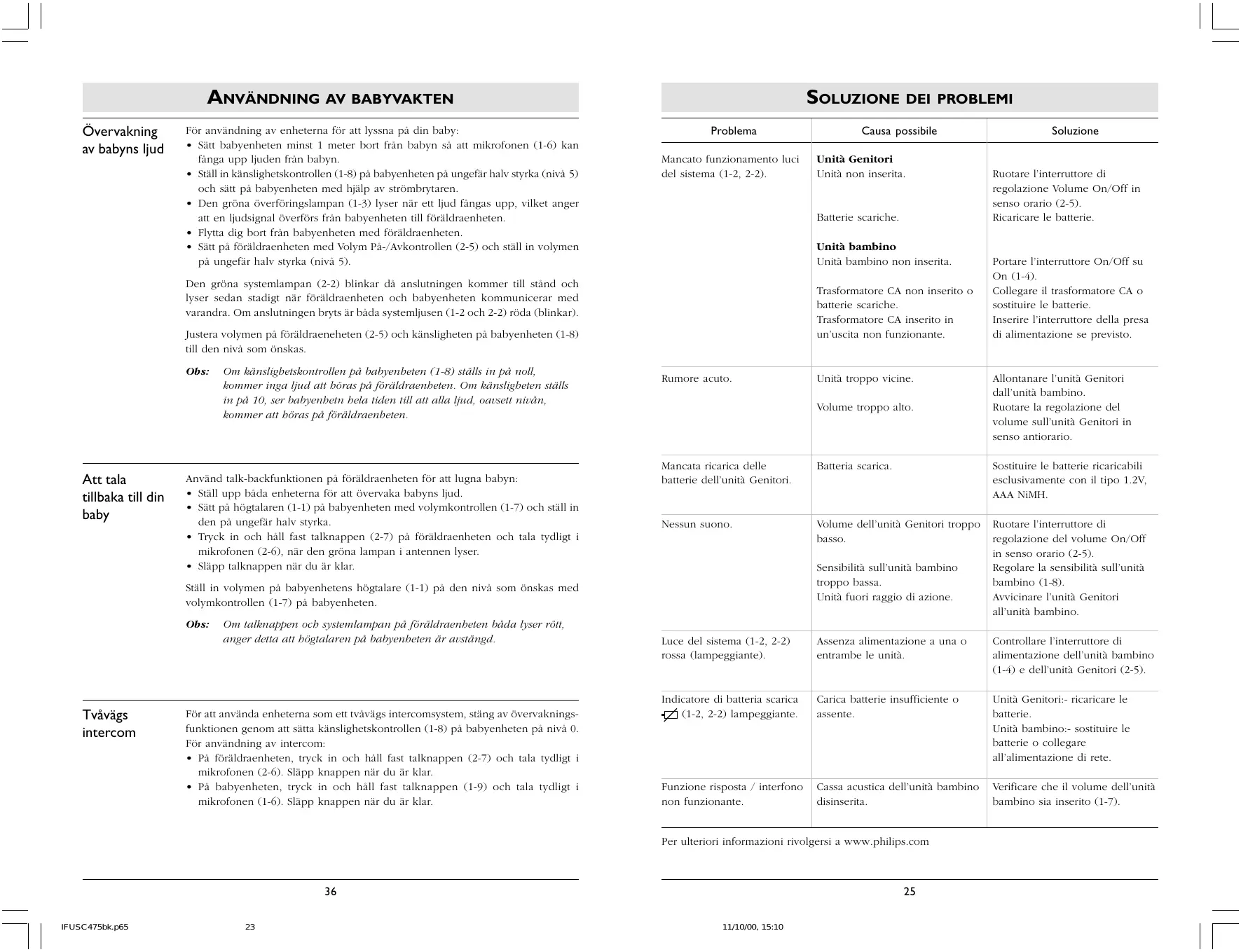 Ruotare l’interruttore di regolazione Volume On/Off in senso orario (2-5). Ricaricare le batterie. Batteria scarica. Per ulteriori informazioni rivolgersi a www.philips.com IFUSC475bk.p65 Soluzione Mancata ricarica delle batterie dell’unità Genitori. Ställ in volymen på babyenhetens högtalare (1-1) på den nivå som önskas med volymkontrollen (1-7) på babyenheten. Obs: Unità Genitori Unità non inserita. Batterie scariche. Den gröna systemlampan (2-2) blinkar då anslutningen kommer till stånd och lyser sedan stadigt när föräldraenheten och babyenheten kommunicerar med varandra. Om anslutningen bryts är båda systemljusen (1-2 och 2-2) röda (blinkar). Obs: Causa possibile