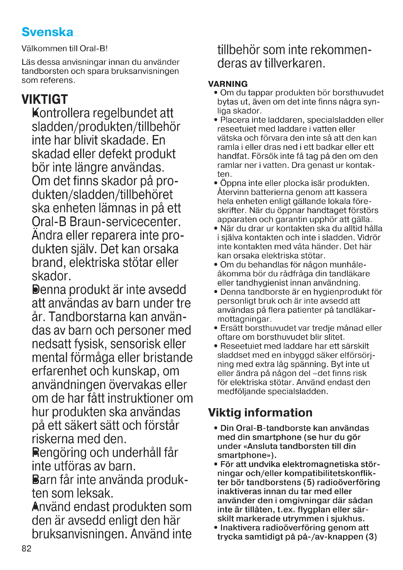 Denna produkt är inte avsedd att användas av barn under tre år. Tandborstarna kan använ- das av barn och personer med nedsatt fysisk, sensorisk eller mental förmåga eller bristande erfarenhet och kunskap, om användningen övervakas eller om de har fått instruktioner om hur produkten ska användas på ett säkert sätt och förstår riskerna med den.