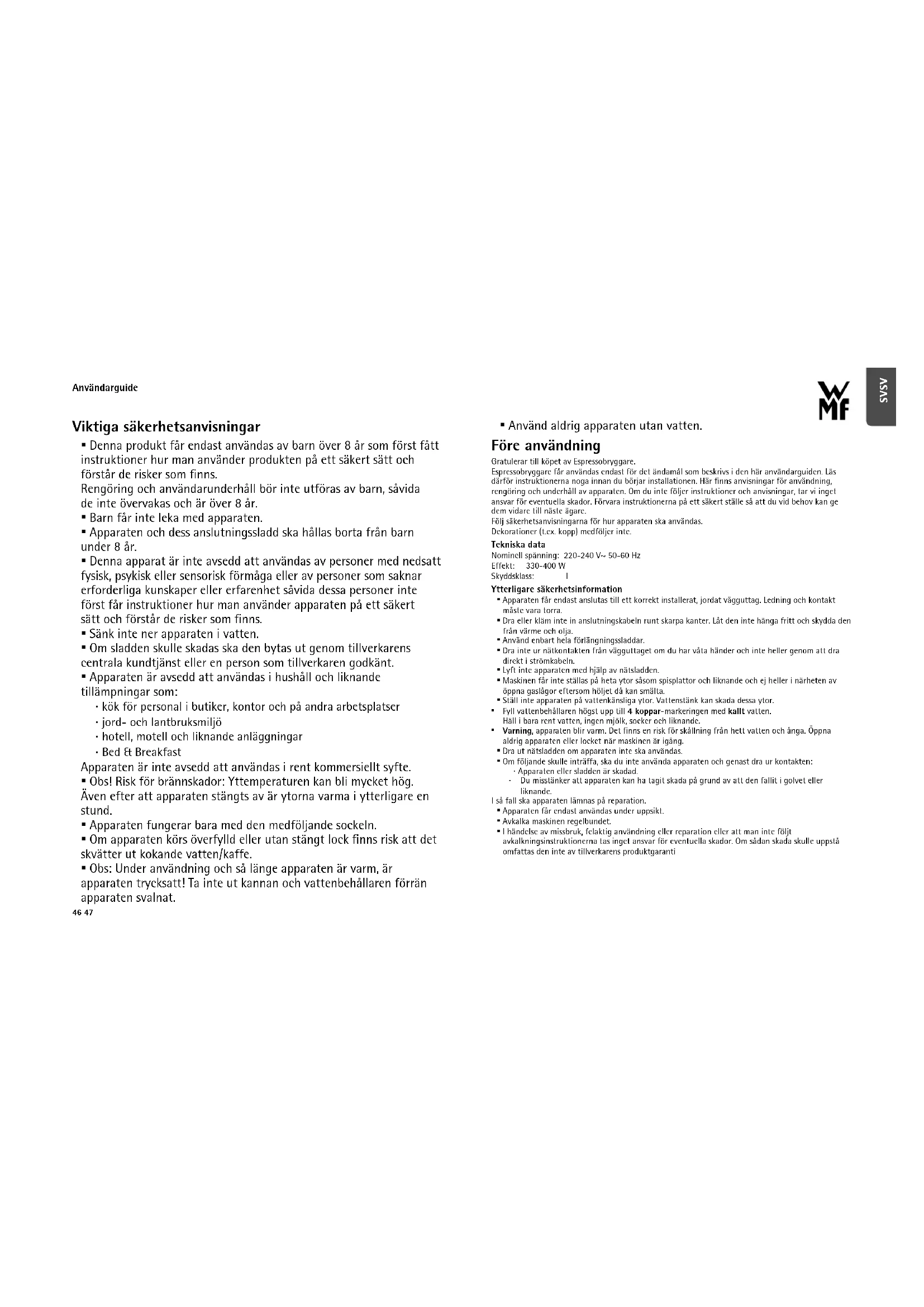 - Använd aldrig apparaten utan vatten. Före användning Gratulerar till köpet av Espressobryggare.Espressobryggare får användas endast för det ändamål som beskrivs i den här användarguiden. Läs därför instruktionerna noga innan du börjar installationen. Här finns anvisningar för användning, rengöring och underhåll av apparaten. Om du inte följer instruktioner och anvisningar, tar vi inget ansvar för eventuella skador. Förvara instruktionerna på ett säkert ställe så att du vid behov kan ge dem vidare till näste ägare.Följ säkerhetsanvisningarna för hur apparaten ska användas. Dekorationer (t.ex. kopp) medföljer inte. Tekniska data Nominell spänning: 220-240 V~ 50-60 HzEffekt: 330-400 WSkyddsklass: I Ytterligare säkerhetsinformation
