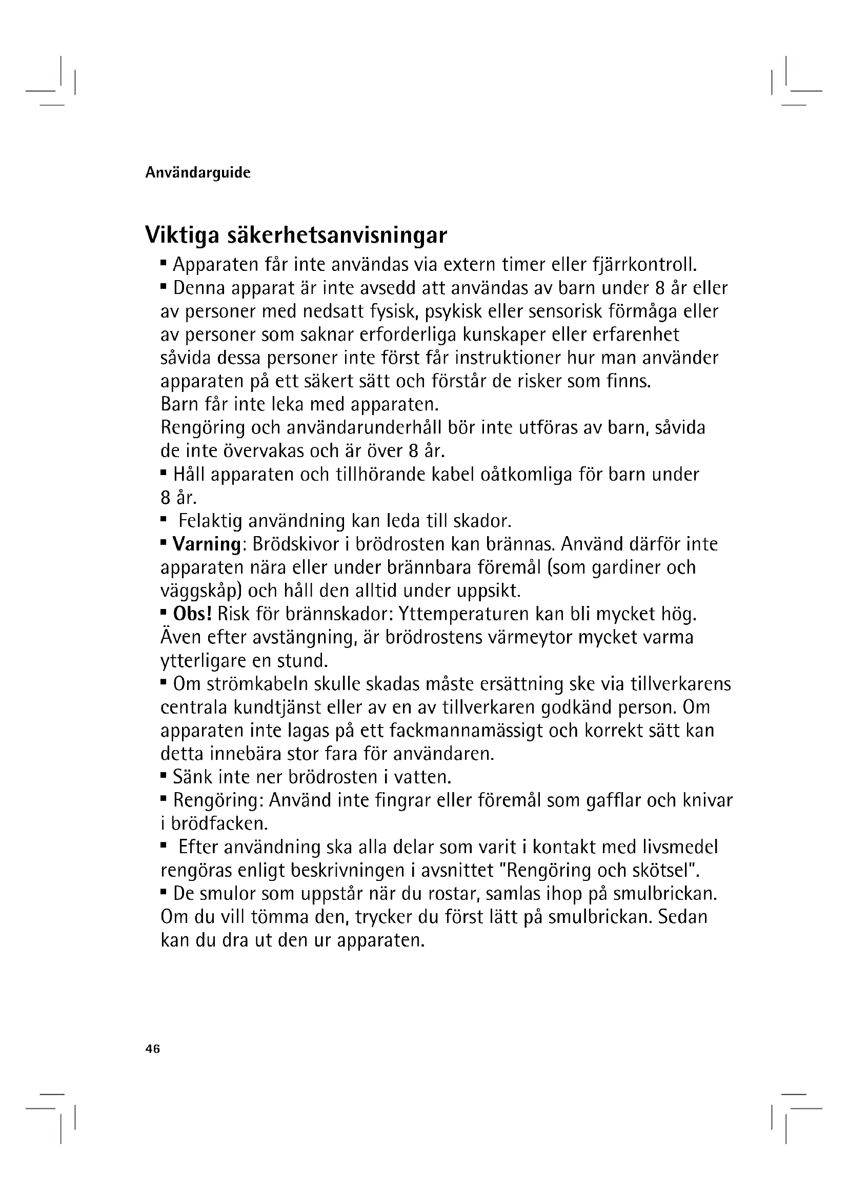 Felaktig användning kan leda till skador. - Varning: Brodkivor i brodrosten kan brannas. Använd darüber inte apparaten nara aller under brännbara foremål (som gardiner och vaggskap) ochhall den alltid under uppsikt.