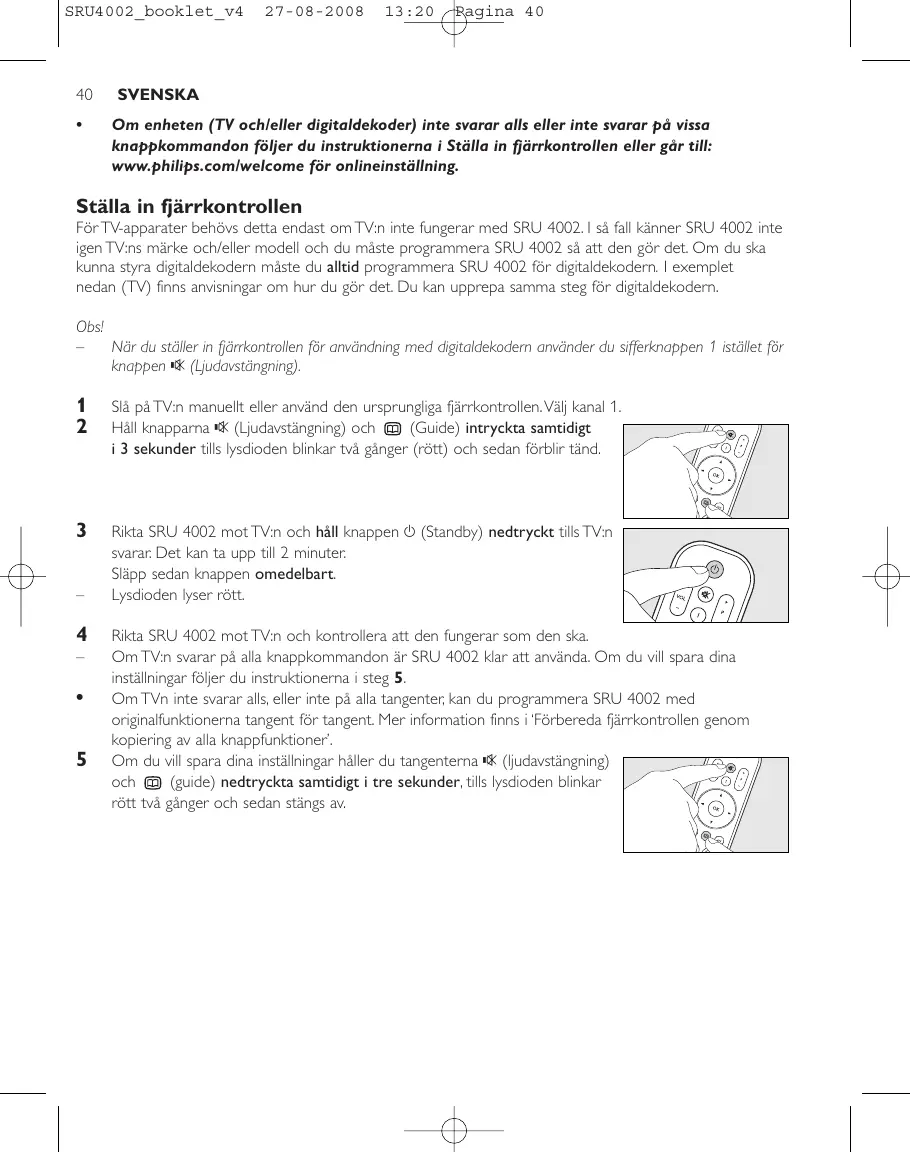 Rikta SRU 4002 mot TV:n och kontrollera att den fungerar som den ska. Om TV:n svarar på alla knappkommandon är SRU 4002 klar att använda. Om du vill spara dina inställningar följer du instruktionerna i steg 5. Om TVn inte svarar alls, eller inte på alla tangenter, kan du programmera SRU 4002 med originalfunktionerna tangent för tangent. Mer information finns i ‘Förbereda fjärrkontrollen genom kopiering av alla knappfunktioner’. Om du vill spara dina inställningar håller du tangenterna s (ljudavstängning) och (guide) nedtryckta samtidigt i tre sekunder, tills lysdioden blinkar rött två gånger och sedan stängs av.