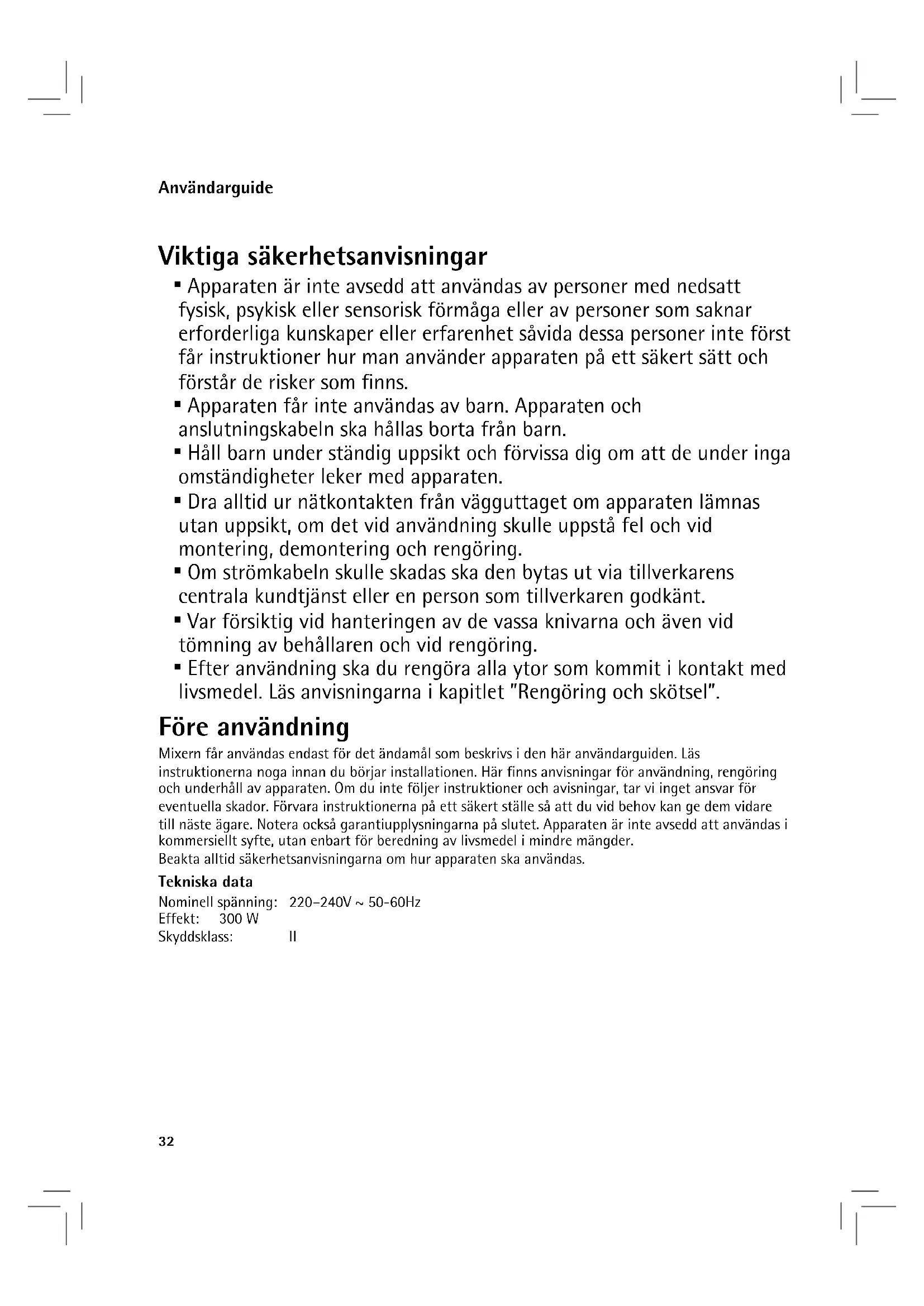 - Efter användning ska du rengöra alla ytor som kommit i kontakt med livsmedel. Läs anvisningarna i kapitlet ”Rengöring och skötsel”. Före användning Mixern får användas endast för det ändamål som beskrivs i den här användarguiden. Läs instruktionerna noga innan du börjar installationen. Här finns anvisningar för användning, rengöring och underhåll av apparaten. Om du inte följer instruktioner och avisningar, tar vi inget ansvar för eventuella skador. Förvara instruktionerna på ett säkert ställe så att du vid behov kan ge dem vidare till näste ägare. Notera också garantiupplysningarna på slutet. Apparaten är inte avsedd att användas i kommersiellt syfte, utan enbart för beredning av livsmedel i mindre mängder. Beakta alltid säkerhetsanvisningarna om hur apparaten ska användas. Tekniska data Nominell spänning: 220–240V ~ 50-60Hz Effekt: 300 W Skyddsklass: II33