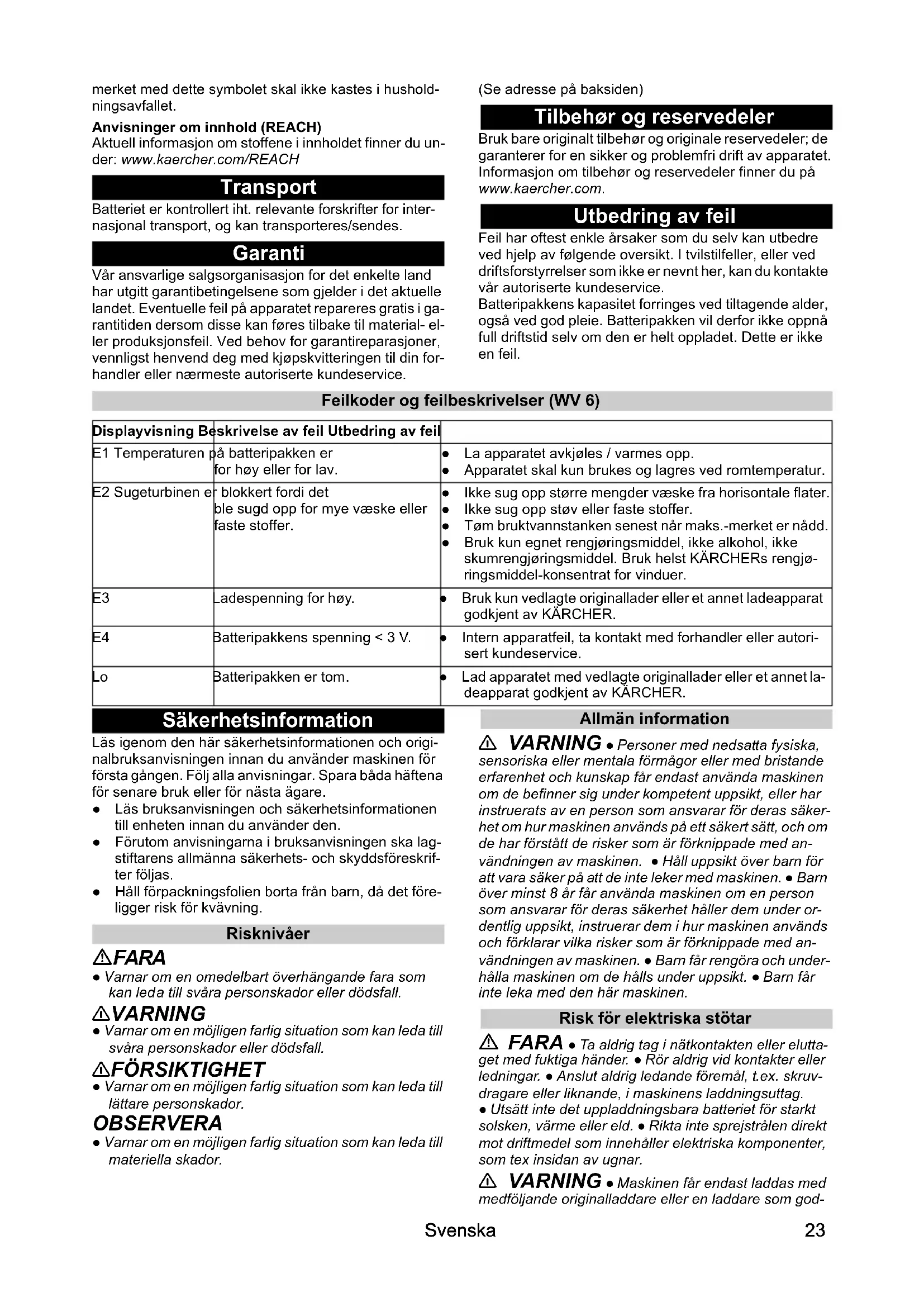 60 min23 Svenska merket med dette symbolet skal ikke kastes i hushold- ningsavfallet. Anvisninger om innhold (REACH) Aktuell informasjon om stoffene i innholdet finner du un- der: www.kaercher.com/REACH Transport Batteriet er kontrollert iht. relevante forskrifter for inter- nasjonal transport, og kan transporteres/sendes. Garanti Vår ansvarlige salgsorganisasjon for det enkelte land har utgitt garantibetingelsene som gjelder i det aktuelle landet. Eventuelle feil på apparatet repareres gratis i ga- rantitiden dersom disse kan føres tilbake til material- el- ler produksjonsfeil. Ved behov for garantireparasjoner, vennligst henvend deg med kjøpskvitteringen til din for- handler eller nærmeste autoriserte kundeservice. (Se adresse på baksiden) Tilbehør og reservedeler Bruk bare originalt tilbehør og originale reservedeler; de garanterer for en sikker og problemfri drift av apparatet. Informasjon om tilbehør og reservedeler finner du på www.kaercher.com. Utbedring av feil Feil har oftest enkle årsaker som du selv kan utbedre ved hjelp av følgende oversikt. I tvilstilfeller, eller ved driftsforstyrrelser som ikke er nevnt her, kan du kontakte vår autoriserte kundeservice. Batteripakkens kapasitet forringes ved tiltagende alder, også ved god pleie. Batteripakken vil derfor ikke oppnå full driftstid selv om den er helt oppladet. Dette er ikke en feil. Feilkoder og feilbeskrivelser (WV 6) Säkerhetsinformation Läs igenom den här säkerhetsinformationen och origi- nalbruksanvisningen innan du använder maskinen för första gången. Följ alla anvisningar. Spara båda häftena för senare bruk eller för nästa ägare. ● Läs bruksanvisningen och säkerhetsinformationen till enheten innan du använder den. ● Förutom anvisningarna i bruksanvisningen ska lag- stiftarens allmänna säkerhets- och skyddsföreskrif- ter följas. ● Håll förpackningsfolien borta från barn, då det före- ligger risk för kvävning. Risknivåer FARA ● Varnar om en omedelbart överhängande fara som kan led a till svåra personskador eller dödsfall. 몇 VARNING ● Varnar om en möjligen farlig situation som kan leda till svåra personskador eller dödsfall. 몇 FÖRSIKTIGHET ● Varnar om en möjligen farlig situation som kan leda till lättare personskador. OBSERVERA ● Varnar om en möjligen farlig situation som kan leda till materiella skador. Allmän information 몇 VARNING ● Personer med nedsatta fysiska, sensoriska eller mentala förmågor eller med bristande erfarenhet och kunskap får endast använda maskinen om de befinner sig under kompetent uppsikt, eller har instruerats av en person som ansvarar för deras säker- het om hur maskinen används på ett säkert sätt, och om de har förstått de risker som är förknippade med an- vändningen av maskinen. ● Håll uppsikt över barn för att vara säker på att de inte leker med maskinen. ● Barn över minst 8 år får använda maskinen om en person som ansvarar för deras säkerhet håller dem under or- dentlig uppsikt, instruerar dem i hur maskinen används och förklarar vilka risker som är förknippade med an- vändningen av maskinen. ● Barn får rengöra och under- hålla maskinen om de hålls under uppsikt. ● Barn får inte leka med den här maskinen. Risk för elektriska stötar FARA ● Ta aldrig tag i nätkontakten eller elutta- get med fuktiga händer. ● Rör aldrig vid kontakter eller ledningar. ● Anslut aldrig ledande föremål, t.ex. skruv- dragare eller liknande, i maskinens laddningsuttag. ● Utsätt inte det uppladdningsbara batteriet för starkt solsken, värme eller eld. ● Rikta inte sprejstrålen direkt mot driftmedel som innehåller elektriska komponenter, som tex insidan av ugnar. 몇 VARNING ● Maskinen får endast laddas med medföljande originalladdare eller en laddare som god- Displayvisning Beskrivelse av feil Utbedring av feil E1 Temperaturen på batteripakken er for høy eller for lav. ● La apparatet avkjøles / varmes opp. ● Apparatet skal kun brukes og lagres ved romtemperatur. E2 Sugeturbinen er blokkert fordi det ble sugd opp for mye væske eller faste stoffer. ● Ikke sug opp større mengder væske fra horisontale flater. ● Ikke sug opp støv eller faste stoffer. ● Tøm bruktvannstanken senest når maks.-merket er nådd. ● Bruk kun egnet rengjøringsmiddel, ikke alkohol, ikke skumrengjøringsmiddel. Bruk helst KÄRCHERs rengjø- ringsmiddel-konsentrat for vinduer. E3 Ladespenning for høy. ● Bruk kun vedlagte originallader eller et annet ladeapparat godkjent av KÄRCHER. E4 Batteripakkens spenning < 3 V. ● Intern apparatfeil, ta kontakt med forhandler eller autori- sert kundeservice. Lo Batteripakken er tom. ● Lad apparatet med vedlagte originallader eller et annet la- deapparat godkjent av KÄRCHER.Svenska