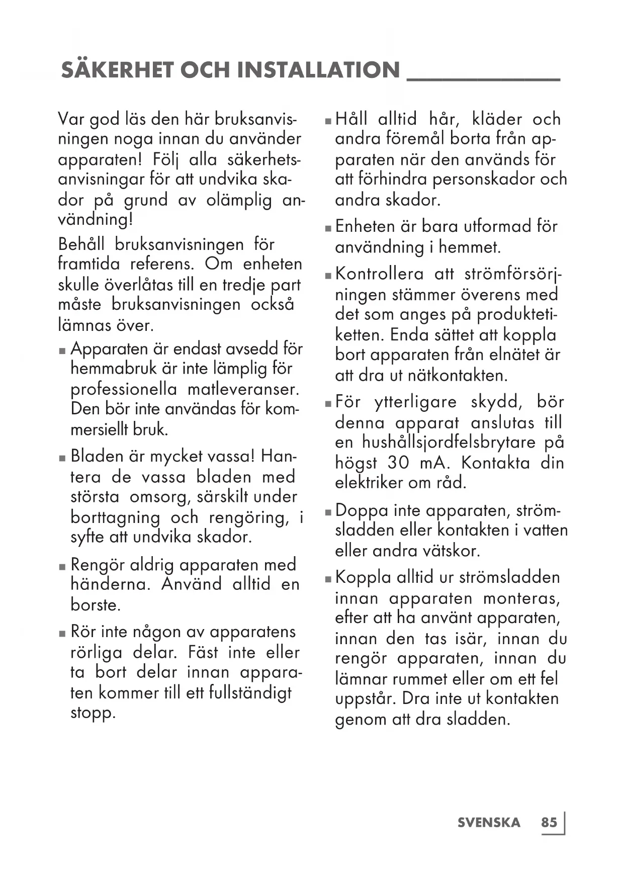 Koppla alltid ur strömsladden innan apparaten monteras, efter att ha använt apparaten, innan den tas isär, innan du rengör apparaten, innan du lämnar rummet eller om ett fel uppstår. Dra inte ut kontakten genom att dra sladden.86 SVENSKA