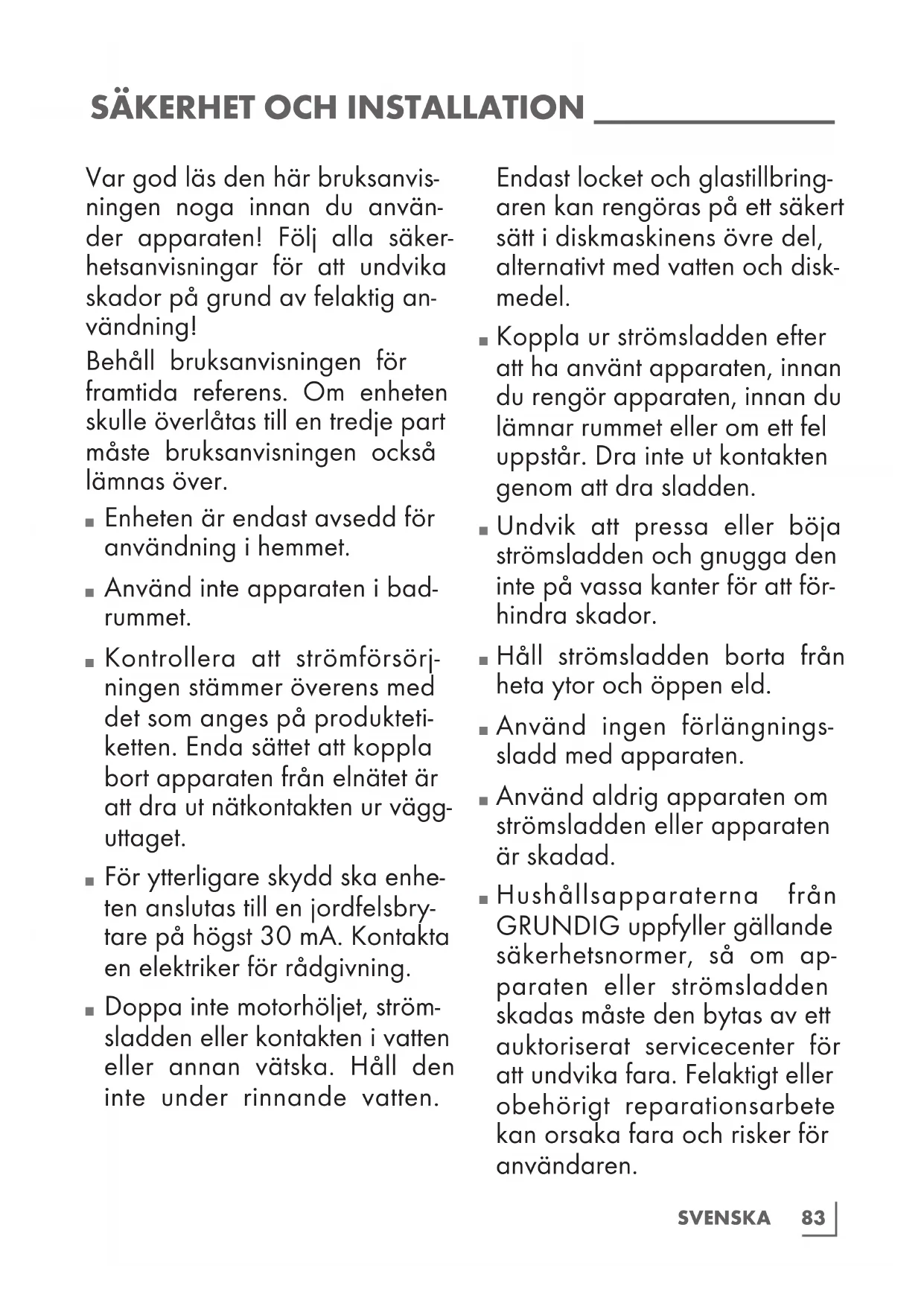 Hushållsapparaterna från GRUNDIG uppfyller gällande säkerhetsnormer, så om ap- paraten eller strömsladden skadas måste den bytas av ett auktoriserat servicecenter för att undvika fara. Felaktigt eller obehörigt reparationsarbete kan orsaka fara och risker för användaren.84 SVENSKA
