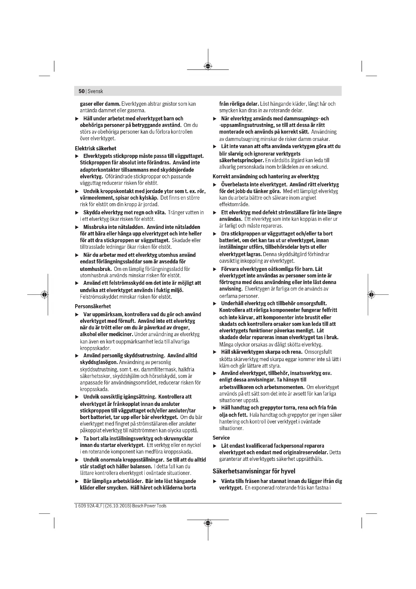 Spåndjup mm 0 – 1,6 0 – 2,6 Falsdjup mm 0 – 9 0 – 9 max. hyvelbredd mm 82 82 Vikt enligt EPTA-Procedure 01:2014 kg 3,4 3,4 Skyddsklass / II / II Svensk | 51 Bosch Power Tools 1 609 92A 4LF | (26.10.2018)52 | Svensk 1 609 92A 4LF | (26.10.2018) Bosch Power Tools Uppgifterna gäller för en märkspänning på [U] 230V. Vid avvikande spänning och för utföranden i vissa länder kan uppgifterna variera. Buller-/vibrationsdata Bullernivåvärde fastställt enligt EN62841-2-14. Den A-klassade bullernivån hos elverktyg ligger typiskt på: bullertrycknivå 84dB(A); bullernivå 95dB(A). Osäkerhet K=3dB. Bär hörselskydd! Totala vibrationsvärden a
