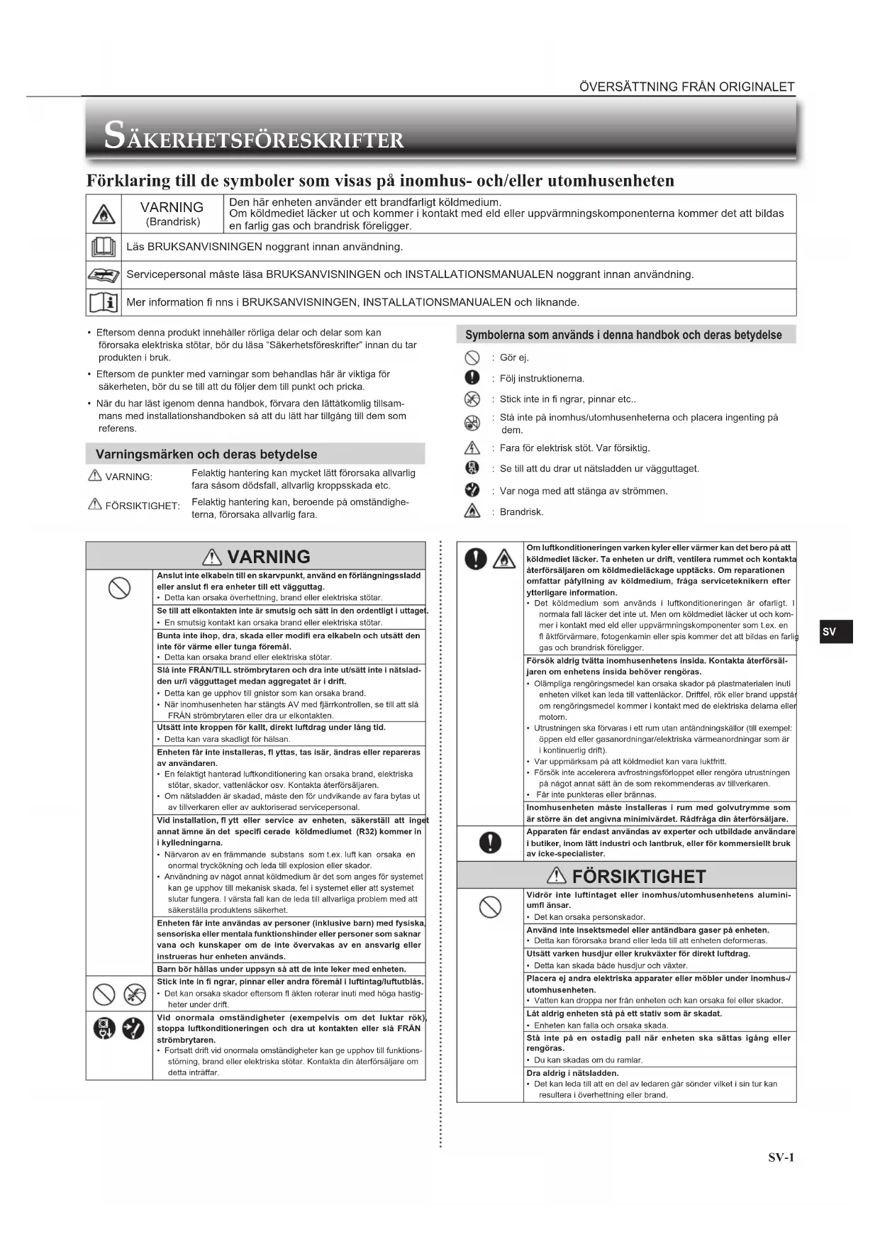 - Eftersom denna produkt innehåller rörliga delar och delar som kan förorsaka elektriska stötar, bör du läsa “Säkerhetsföreskrifter” innan du tar produkten i bruk.• Eftersom de punkter med varningar som behandlas här är viktiga för säkerheten, bör du se till att du följer dem till punkt och pricka.• När du har läst igenom denna handbok, förvara den lättåtkomlig tillsam-mans med installationshandboken så att du lätt har tillgång till dem som referens. Varningsmärken och deras betydelse VARNING:Felaktig hantering kan mycket lätt förorsaka allvarlig fara såsom dödsfall, allvarlig kroppsskada etc. FÖRSIKTIGHET:Felaktig hantering kan, beroende på omständighe-terna, förorsaka allvarlig fara. Symbolerna som används i denna handbok och deras betydelse : Gör ej. : Följ instruktionerna. : Stick inte in fi ngrar, pinnar etc.. : Stå inte på inomhus/utomhusenheterna och placera ingenting på dem. : Fara för elektrisk stöt. Var försiktig. : Se till att du drar ut nätsladden ur vägguttaget. : Var noga med att stänga av strömmen. : Brandrisk.
