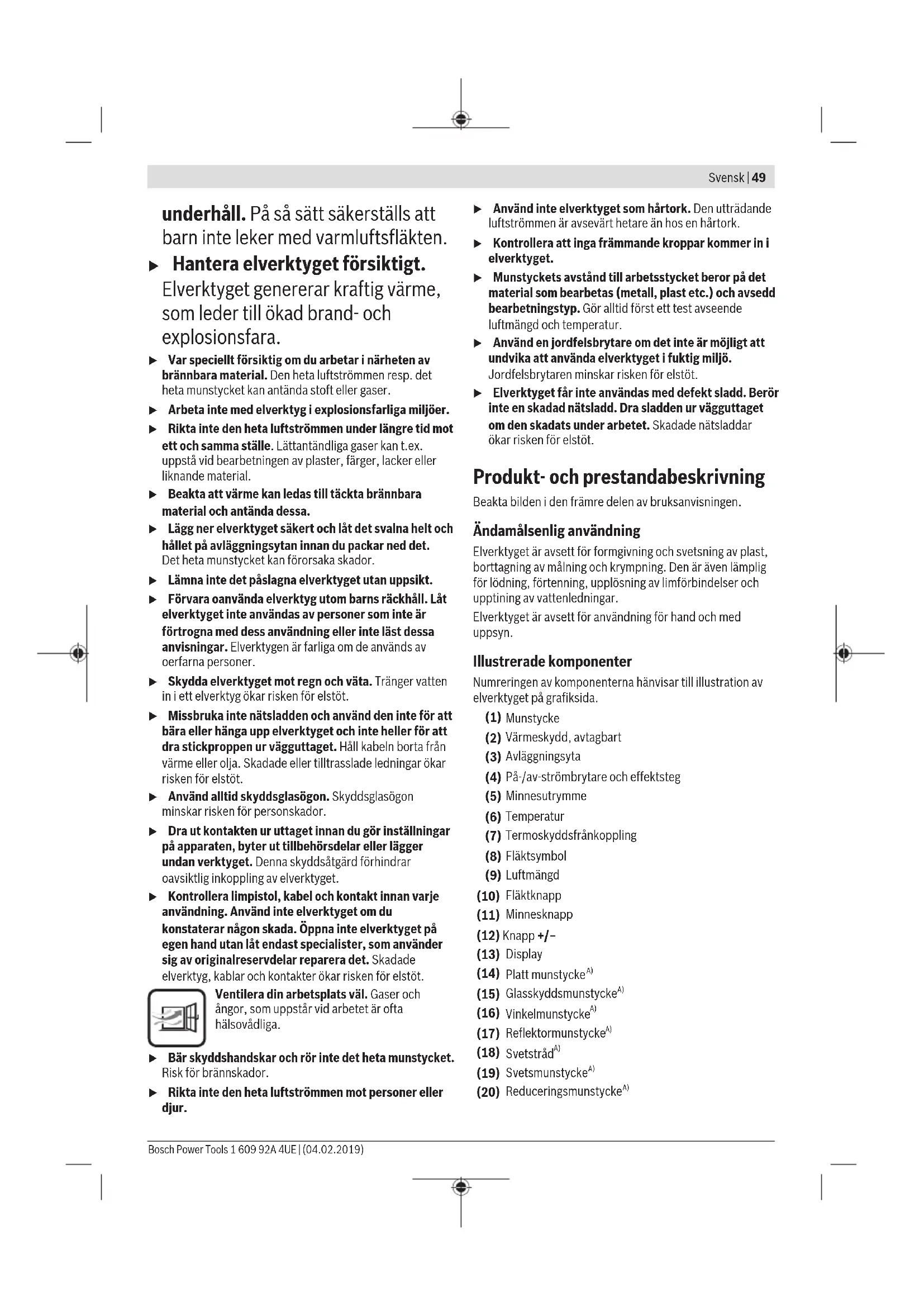 50 150 – Svalna arbetsstycke – Torka färg 1 250 350 Ändra form på plaströren 2 350 400 Svetsning av plast 3 450 500 Ta bort lack 4 550 400 Mjuklödning A) visas inte på displayen För att aktivera en kombination trycker du på minnesknappen(11) tills det önskade numret visas på indikeringen(5). Spara egen kombination: – Välj önskad minnesplats genom att trycka på minnesknappen(11). – Ställ in önskad temperatur och luftmängd. Minnesplatsen(5) blinkar för att visa att den sparade kombinationen har ändrats. – Tryck på minnesknappen(11) och håll den intryckt. Minnesplatsen(5) blinkar i ungefär 2sekunder. Så snart den lyser permanent är den nya kombinationen sparad. Arbetsanvisningar u Dra stickproppen ur nätuttaget innan arbeten utförs på elverktyget. Observera: håll inte munstycket(1) för nära arbetsstycket. Luftansamlingen kan leda till överhettning av elverktyget. Ta av värmeskyddet För arbeten på speciellt trånga ställen kan du ta av värmeskyddet(2) genom att vrida. u Var försiktig med det heta munstycket! Vid arbete utan värmeskydd föreligger ökad risk för brännskador. Bosch Power Tools 1 609 92A 4UE | (04.02.2019)52 | Svensk För att ta av resp. sätta på värmeskyddet(2), stäng av elverktyget och låt det svalna. För snabbare avkylning kan du också låta elverktyget gå med lägsta inställbara temperatur. Ställa av elverktyget Ställ elverktyget på avställningsytan(3) för att låta det svalna eller för att få båda händer fria. u Arbeta försiktigt med det avställda elverktyget! Du kan bränna dig på det heta munstycket eller den heta luftströmmen. Placera elverktyget på en jämn, stabil yta. Se till att det inte kan välta. Säkra kabeln inom ditt arbetsområde så att den inte kan välta eller dra ner elverktyget. Stäng av elverktyget om det inte ska användas på en stund och dra stickproppen ur vägguttaget. Arbetsexempel (sebildA–G) Bilderna av arbetsexemplen hittar du på grafiksidorna. Munstyckets avstånd till arbetsstycket beror på det material som bearbetas (metall, plast etc.) och avsedd bearbetningstyp. Den optimala temperaturen för respektive användning fastställs med praktiska försök. Gör alltid först ett test avseende luftmängd och temperatur. Börja alltid med ett större avstånd och ett lägre effektsteg. Anpassa sedan avstånd och effektsteg till behovet. Om du inte är säker på vilket material du bearbetar eller hur den heta luften verkar på materialet så bör du testa detta på ett mindre synligt ställe. Du kan arbeta utan tillbehör vid alla arbetsexempel utom ”Ta bort lack från fönsterramen”. Användning av föreslagna tillbehörsdelar underlättar dock arbetet och ökar kvaliteten på resultatet i hög grad. u Var försiktig vid byte av munstycke! Berör inte det heta munstycket. Låt elverktyget svalna och bär handskar vid byte. Du kan bränna dig på det varma munstycket. För snabbare avkylning kan du också låta elverktyget gå med lägsta inställbara temperatur. Ta bort lack/lim (sebildA) Sätt på det platta munstycket(14) (tillbehör). Mjuka upp lacken kort med het luft och lyft den med en ren spackel. Lång tids inverkan från het luft leder till att lacken förbränns och gör det svårare att ta bort den. Många limtyper blir mjuka av värme. Vid uppvärmt lim kan du avlägsna förbindningarna eller ta bort överskottslim. Ta bort lack från fönsterramen (sebildB) u Använd glasskyddsmunstycket (15) (tillbehör). Risk för krossat glas föreligger. På profilerade ytor kan du skrapa av lack med passande spatel och borsta av med en mjuk borste. Tina vattenledningarna (sebildC) u Kontrollera innan uppvärmning att det faktiskt är en vattenledning. Vattenledningar kan vara svåra att skilja från gasledningar. Gasledningar får inte värmas upp under några omständigheter. Sätt på vinkelmunstycket(16) (tillbehör). Värm upp frusna ställen från utlopp och i riktning mot inloppet. Värm upp plaströr samt anslutningar mellan rördelar med extra försiktighet för att undvika skador. Ändra form på plaströren (sebildD) Sätt på reflektormunstycket(17) (tillbehör). Fyll på plaströren med sand och stäng dem på båda sidorna för att förhindra att röret viker ner sig. Värm upp röret försiktigt och jämnt med fram- och återgående rörelser. Svetsa plast (sebildE) Sätt på reduktionsmunstycket(20) och svetsmunstycket(19) (båda tillbehör). Arbetsstycket som ska svetsas och svetstråden(18) (tillbehör) måste vara av samma material (t.ex. båda PVC). Fogen måste vara ren och fettfri. Värm försiktigt upp fogen tills den blir degig. Observera att temperatursteget mellan plastens degiga och flytande tillstånd är litet. Tillför svetstråden(18) och låt den löpa in i spalten så att en jämn sträng uppstår. Mjuklödning (se bildF) Använd för punktlödning reduktionsmunstycket (20), för lödning av rör reflektormunstycket(17) (båda tillbehör). Används lödmetall utan flussmedel, applicera lödfett eller lödpasta på lödstället. Värm upp lödstället 50 till 120sekunder alltefter använt material. Tillsätt lödmetallen. Verktygets temperatur måste smälta lödmetallen. Avlägsna vid behov flussmedlet efter det lödstället kallnat. Krympning (sebildG) Sätt på reflektormunstycket(17) (tillbehör). Välj en passande diameter på krympslangen(21) (tillbehör) till arbetsstycket. Värm upp krympslangen jämnt tills den ligger an tätt mot arbetsstycket. Underhåll och service Underhåll och rengöring u Dra stickproppen ur nätuttaget innan arbeten utförs på elverktyget. u Håll elverktyget och dess ventilationsöppningar rena för bra och säkert arbete. Om nätsladden för bibehållande av verktygets säkerhet måste bytas ut, ska byte ske hos Bosch eller en auktoriserad serviceverkstad för Bosch elverktyg. Kundtjänst och applikationsrådgivning Kundservicen ger svar på frågor beträffande reparation och underhåll av produkte