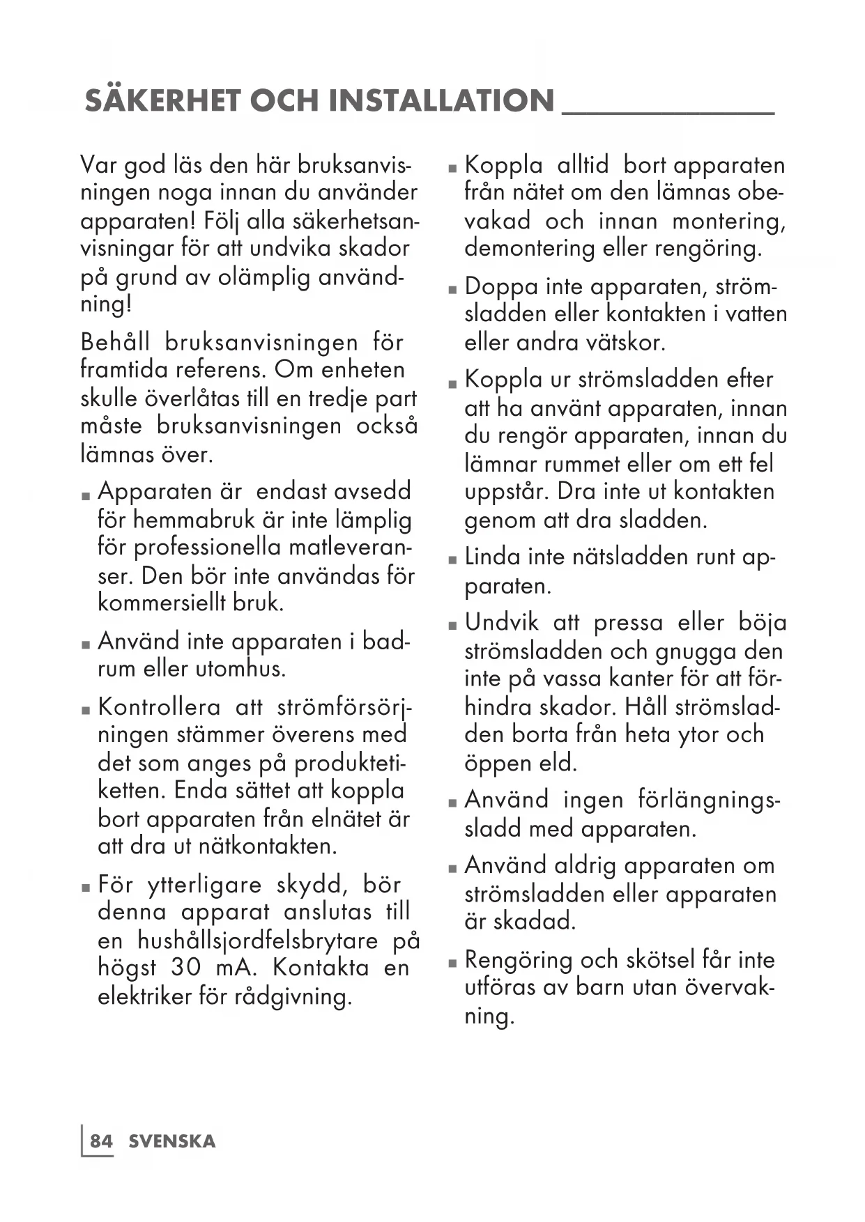 Rengöring och skötsel får inte utföras av barn utan övervak- ning.85 SVENSKA
