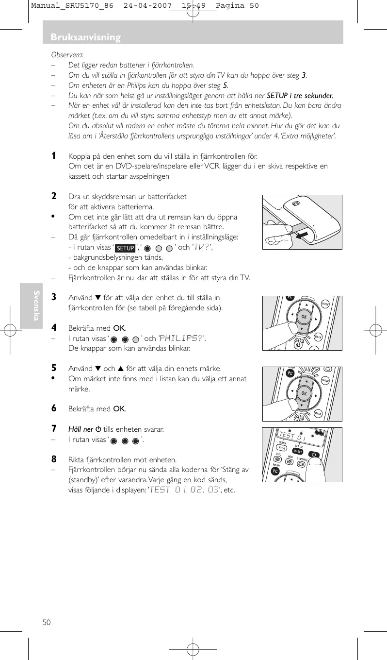 ......../ ......../ ........ (dag/måned/år) Manual_SRU5170_86 24-04-2007 15:49 Pagina 50 Bruksanvisning Observera: Det ligger redan batterier i fjärrkontrollen. Om du vill ställa in fjärkontrollen för att styra din TV kan du hoppa över steg 3. Om enheten är en Philips kan du hoppa över steg 5. Du kan när som helst gå ur inställningsläget genom att hålla ner SETUP i tre sekunder. När en enhet väl är installerad kan den inte tas bort från enhetslistan. Du kan bara ändra märket (t.ex. om du vill styra samma enhetstyp men av ett annat märke). Om du absolut vill radera en enhet måste du tömma hela minnet. Hur du gör det kan du läsa om i ‘Återställa fjärrkontrollens ursprungliga inställningar’ under 4. ‘Extra möjligheter’.
